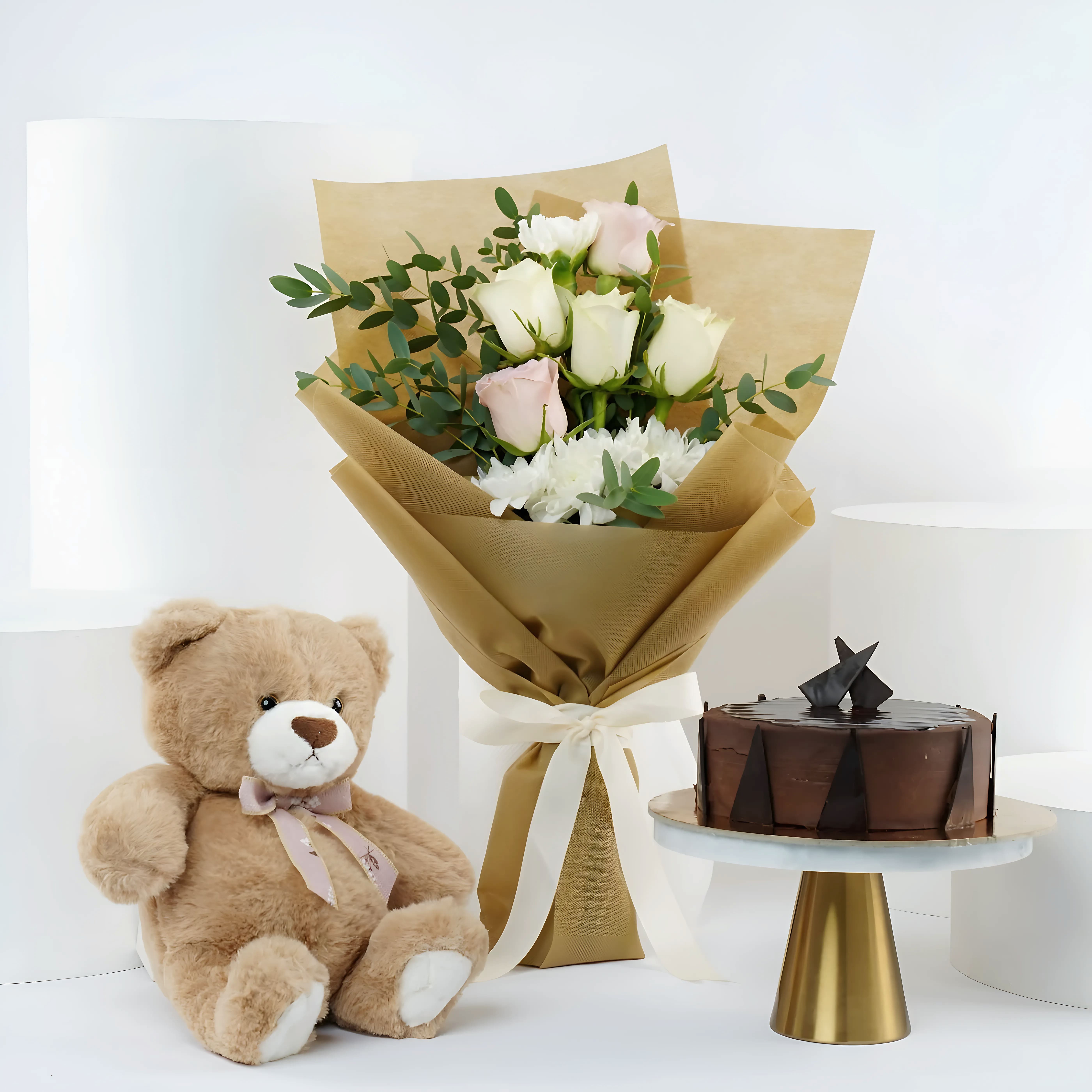 - 7 Mixed Roses - Cake Flavor: Chocolate Ganache on Sponge Cream Cake, Weight: Half kg - One Teddy Bear: 12 Inches"