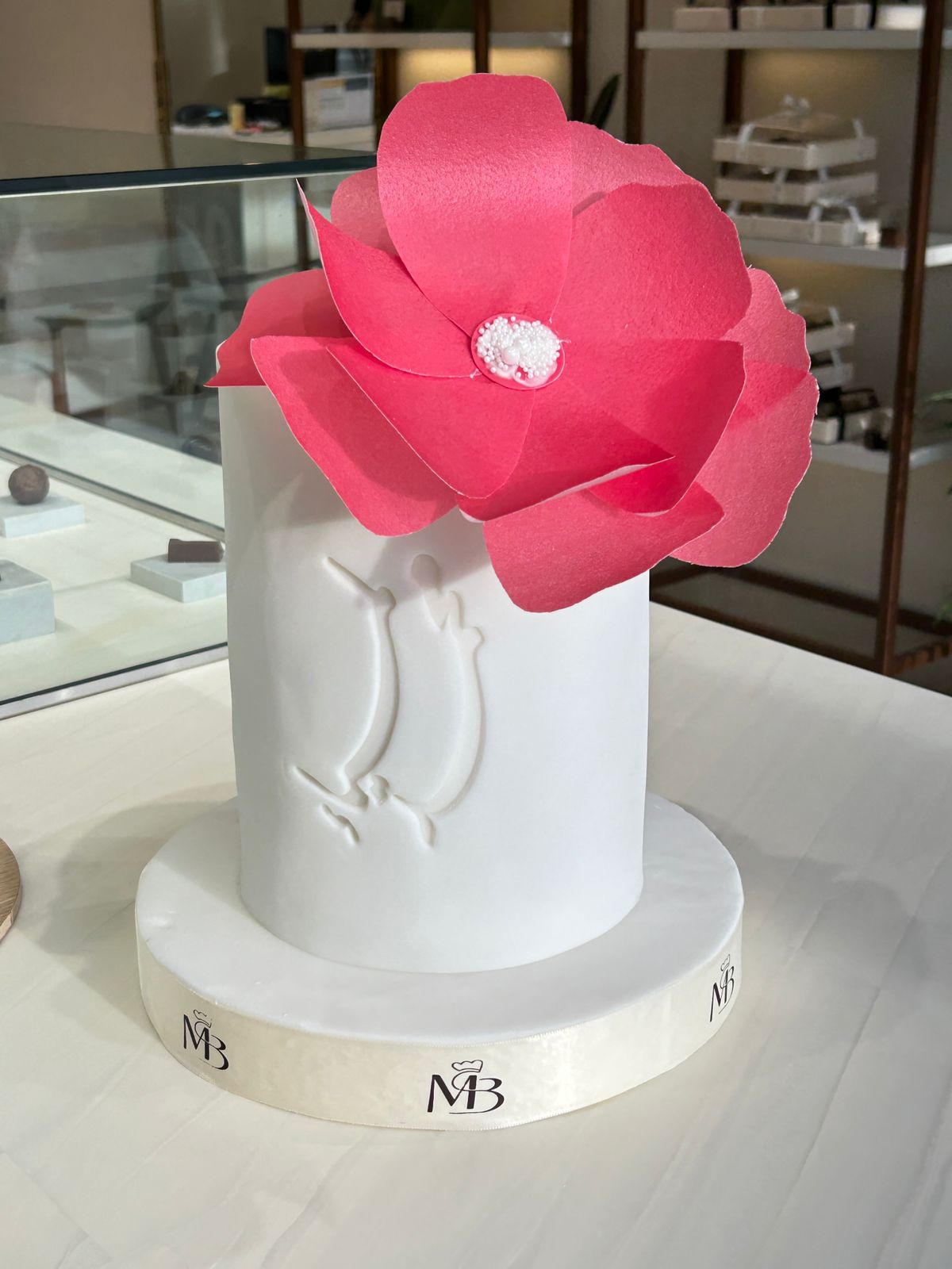 كيكة بيضاء أنيقة مزينة بوردة وردية جريئة ونقشة بسيطة تضيف لمسة فنية. مثالية للمناسبات المميزة.