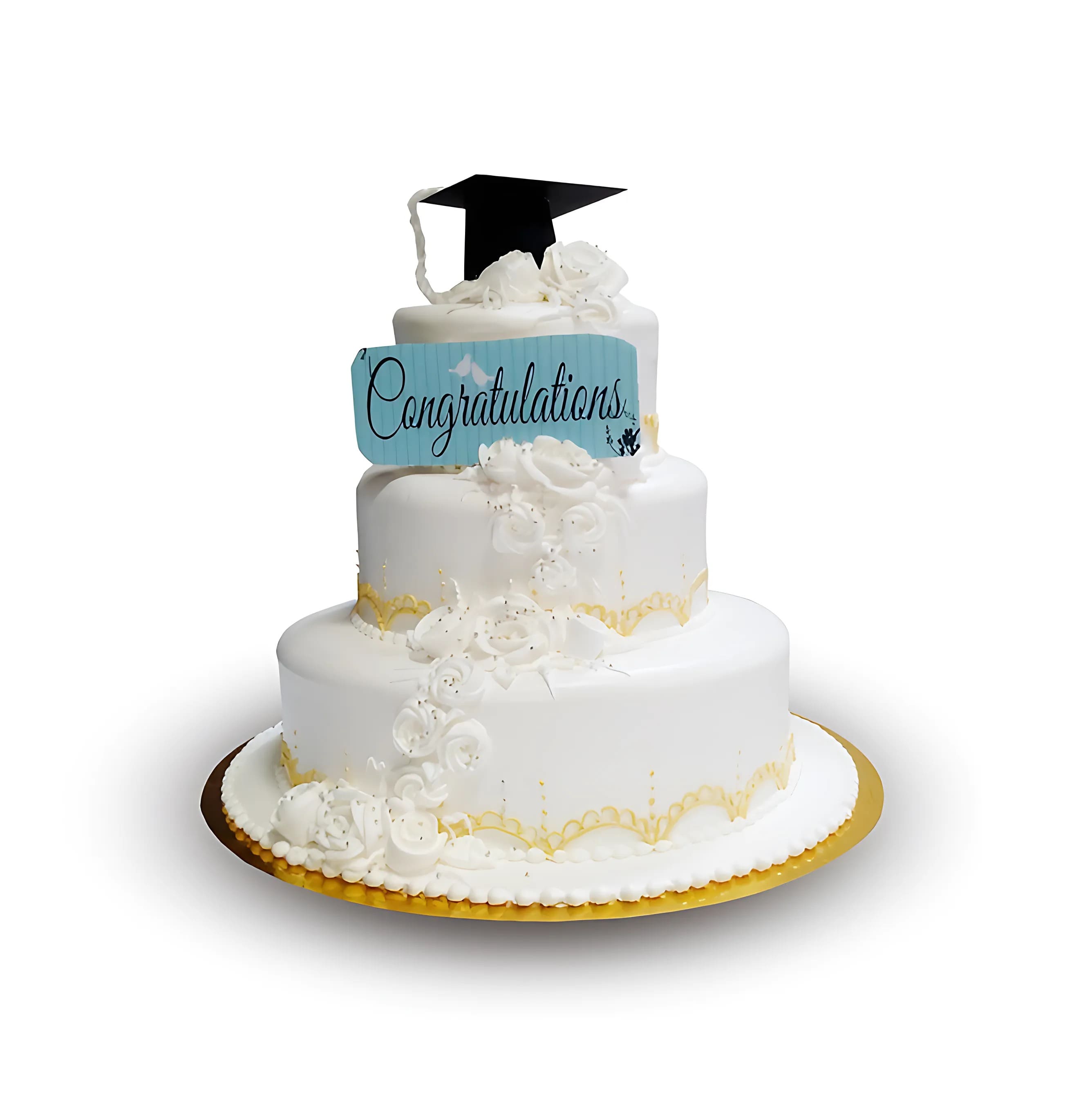 كيكة فاخرة بثلاث طبقات مغطاة بالكريمة البيضاء، مزينة بسلسلة من الورود الناعمة وتفاصيل ذهبية أنيقة. تعلوها قبعة تخرج ولوحة "مبروك التخرج" بلون أزرق سماوي جذاب تكفي لعدد ٣٥ شخص