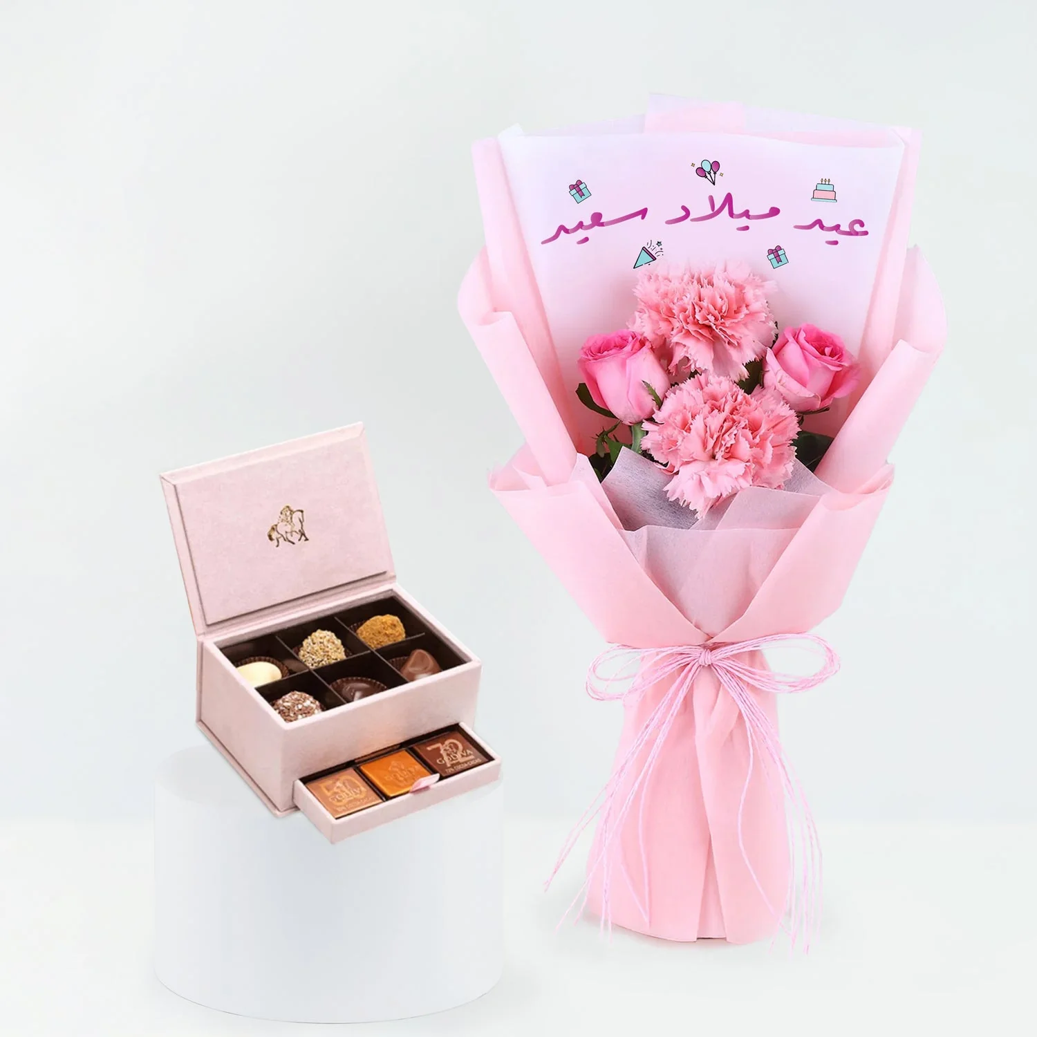 - 1 بوكس شوكولاتة جوديفا ميني بوكس 18 قطعة - 2 قرنفل وردي - 2 وردة جوري - تغليف وردي جميل مع شريط
