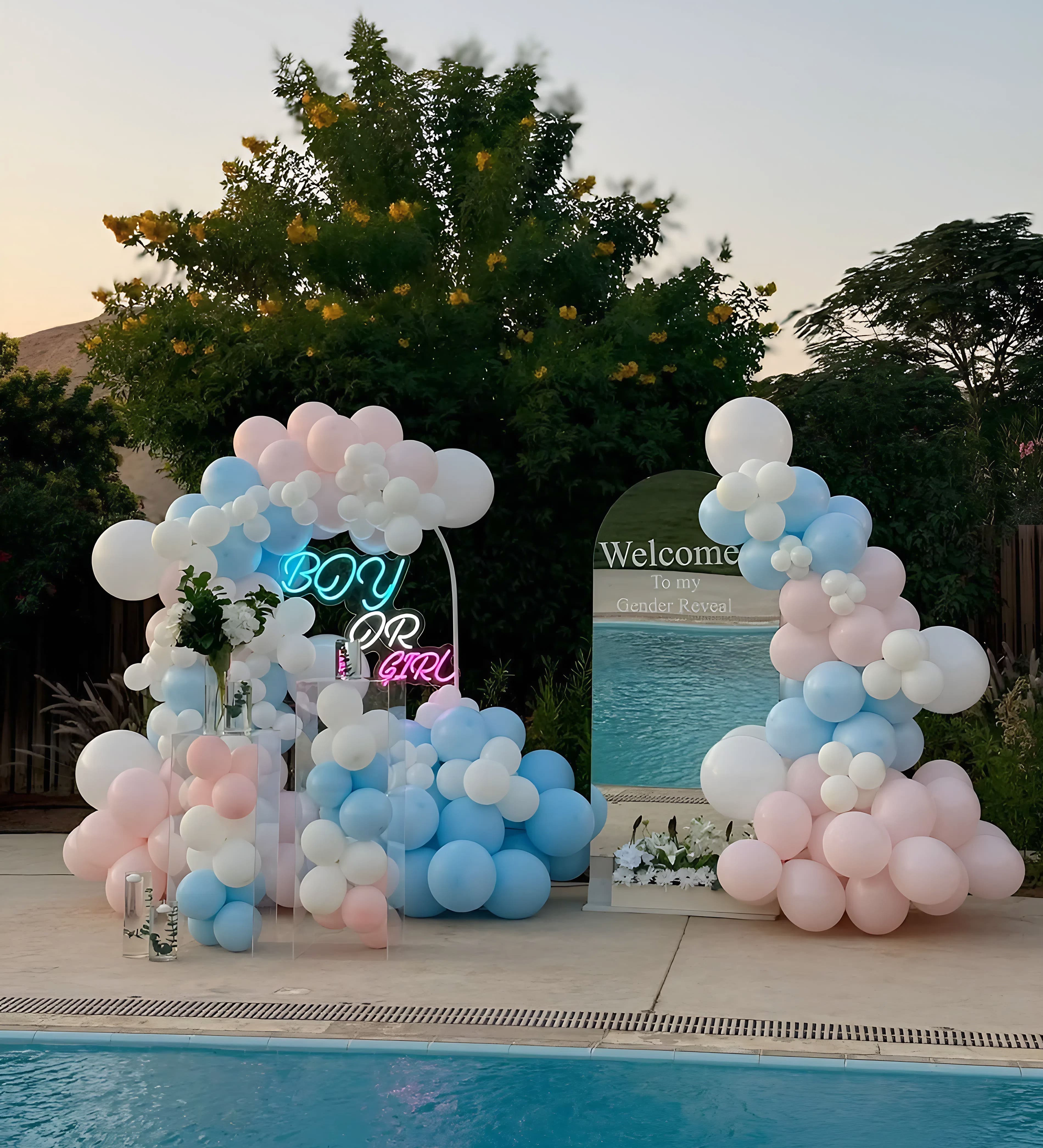 ديكور أنيق لحفلة الكشف عن المولود بجانب المسبح مع بالونات بألوان باستيل ولافتة نيون مضيئة. تصميم عصري مثالي للاحتفالات الخارجية وجلسات التصوير تحت ضوء الغروب.ديكور أنيق لحفلة الكشف عن المولود بجانب المسبح مع بالونات بألوان باستيل ولافتة نيون مضيئة. تصميم عصري مثالي للاحتفالات الخارجية وجلسات التصوير تحت ضوء الغروب.