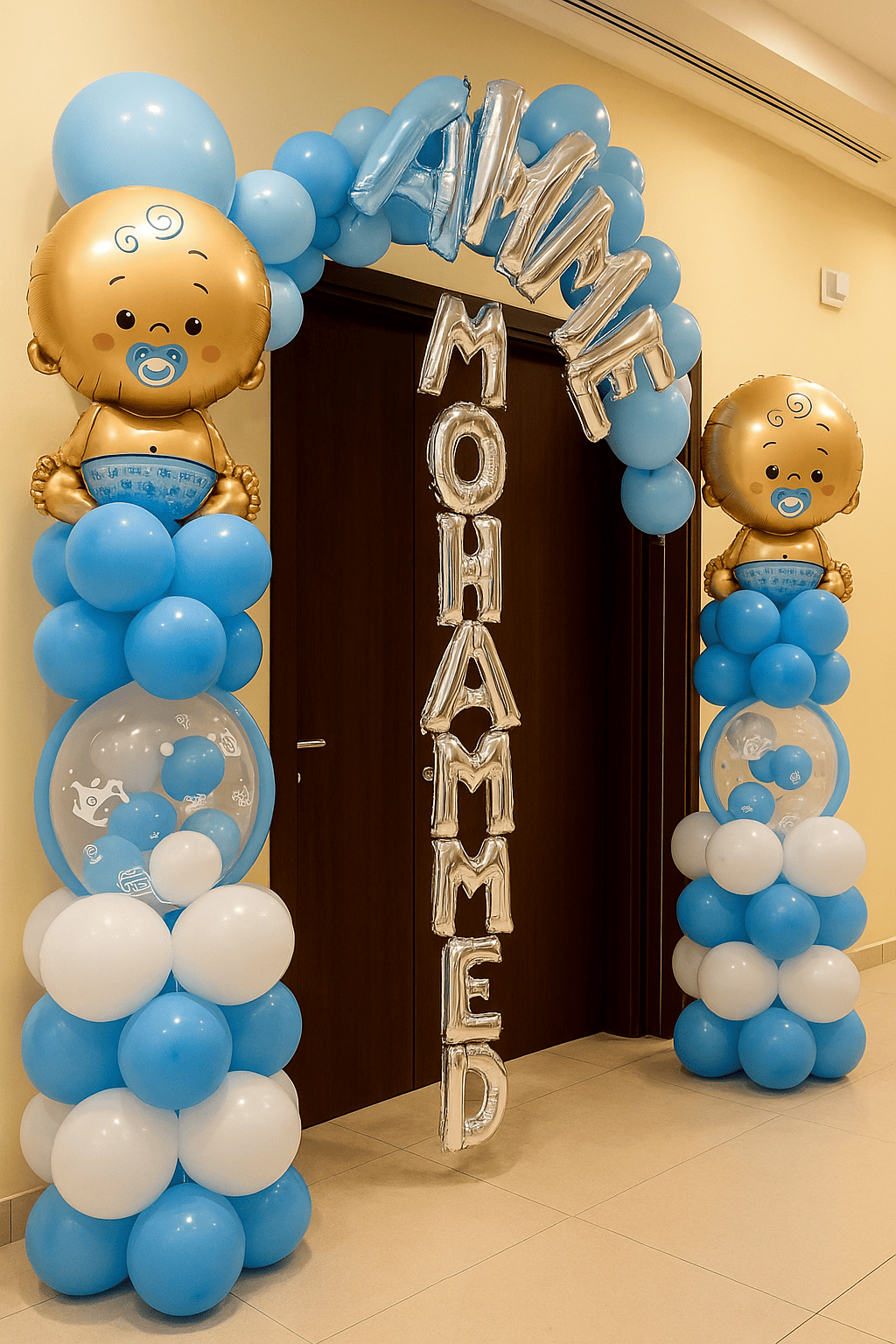 قوس بالونات استقبال مولود بالأزرق والأبيض والذهبي مع مجسمات أطفال لطيفة وتفاصيل اسم المولود. مثالي لحفلات البيبي شاور واستقبال المواليد في المستشفى أو المنزل. ديكور أنيق يضيف لمسة فرح وسحر لاستقبال المولود الجديد.