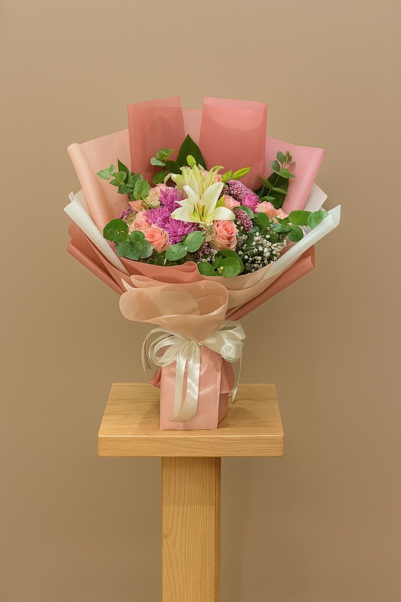 تتكون الباقه من ورد حوري سوباتي عدد 8 + كريز كيني عدد 3 + ليليوم هولندي عدد 1 + جبسوا فيلا 1 + بيبي جوري عدد 1