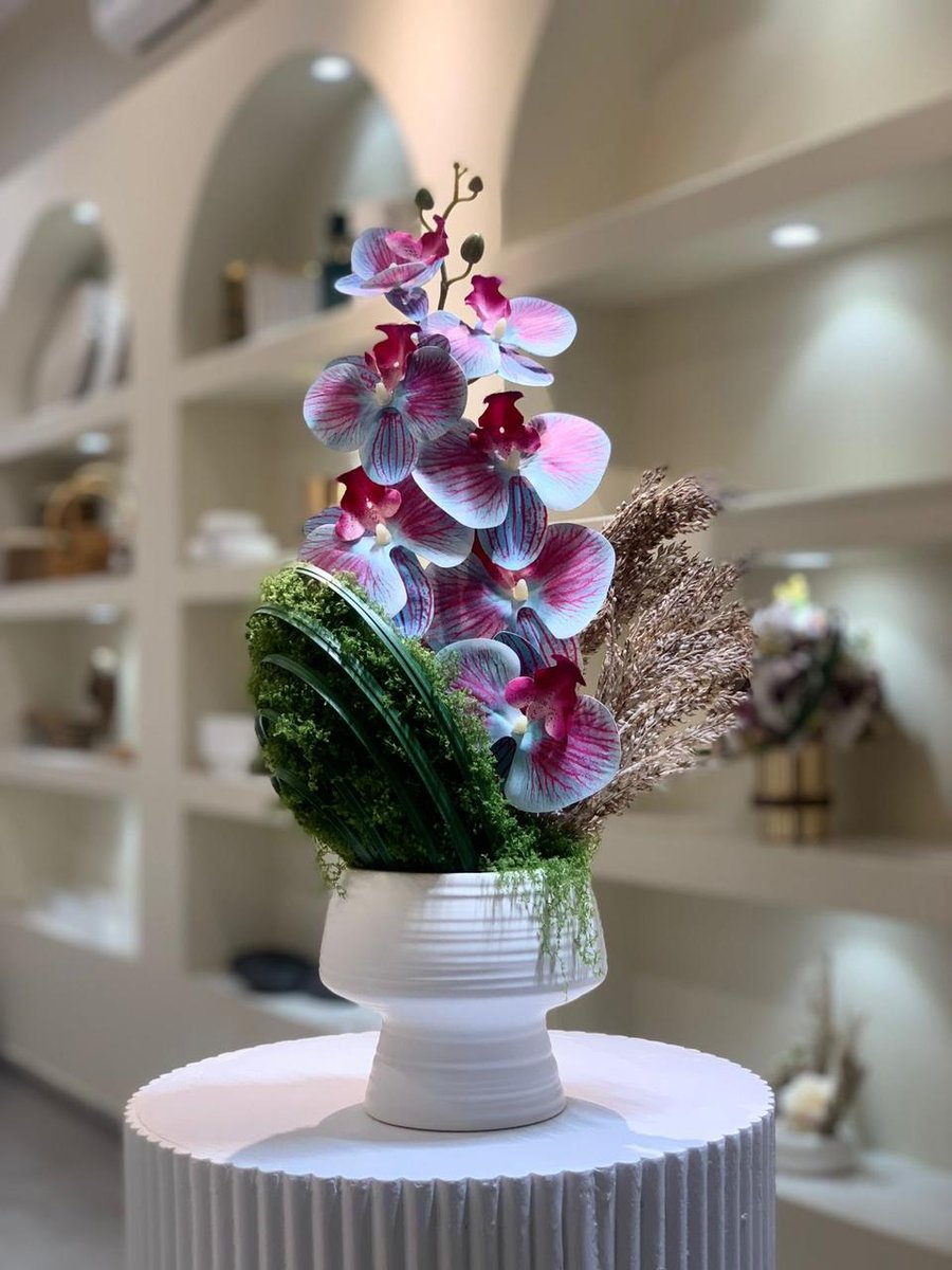 تنسيق زهور أوركيد وردية وبيضاء بتصميم فني عصري مع لمسات خضراء أنيقة، مقدم في مزهرية خزفية بسيطة. مثالي لديكور المنازل الفاخرة، المكاتب، والمساحات العصرية.
