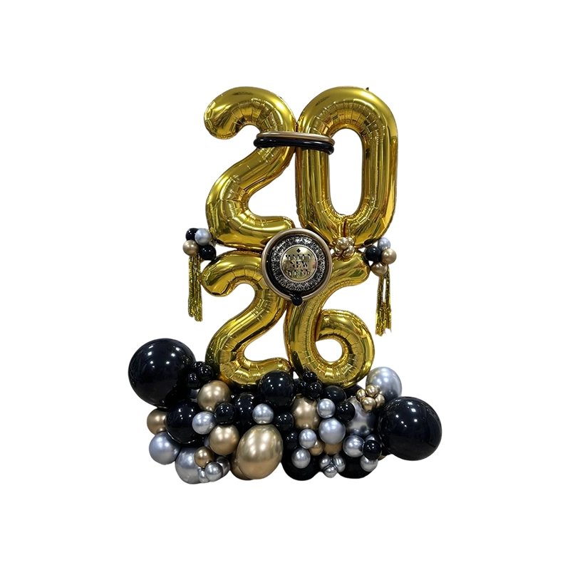تصميم ذهبية2026|ارقام كبيرة يتكون من : - ارقام2026 مقاس 34 انش باللون الذهبي مع اكسسوارت مميزة -بالون قصدير مطبوع HAPPY NEW YEAR -قاعدة بالونات فاخرة و مميزة بالالوان و الاحجام