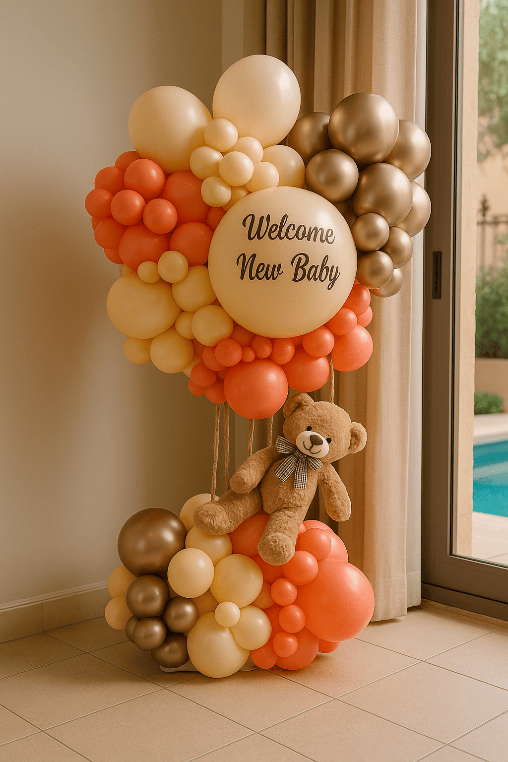 ثيم الدبدوب الأنيق مثالي لاستقبال المواليد وحفلات البيبي شاور. تصميم جميل بألوان الذهبي والبرتقالي والبيج مع دبدوب لطيف يضيف لمسة دفء وأناقة. مناسب للأولاد والبنات ويخلي الاحتفال مميز ومليان حب وفرح.