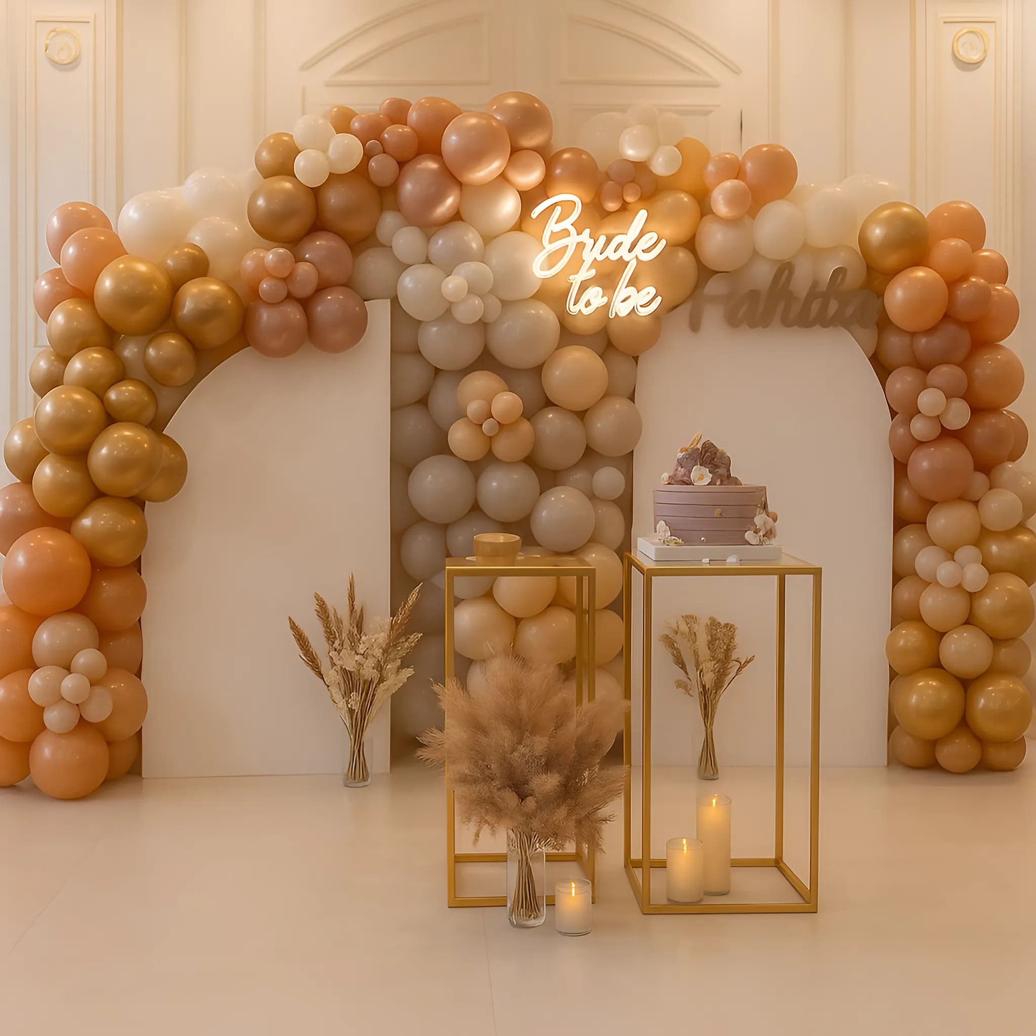 ديكور اللمسة الذهبية يجمع بين ألوان الذهبي والبيج والوردي بطريقة ناعمة وأنيقة. مثالي لحفلات توديع العزوبية أو العروس المقبلة، يعطي أجواء دافئة ولمسة فخمة تجعل المكان كله يشعّ أناقة وفرح.
