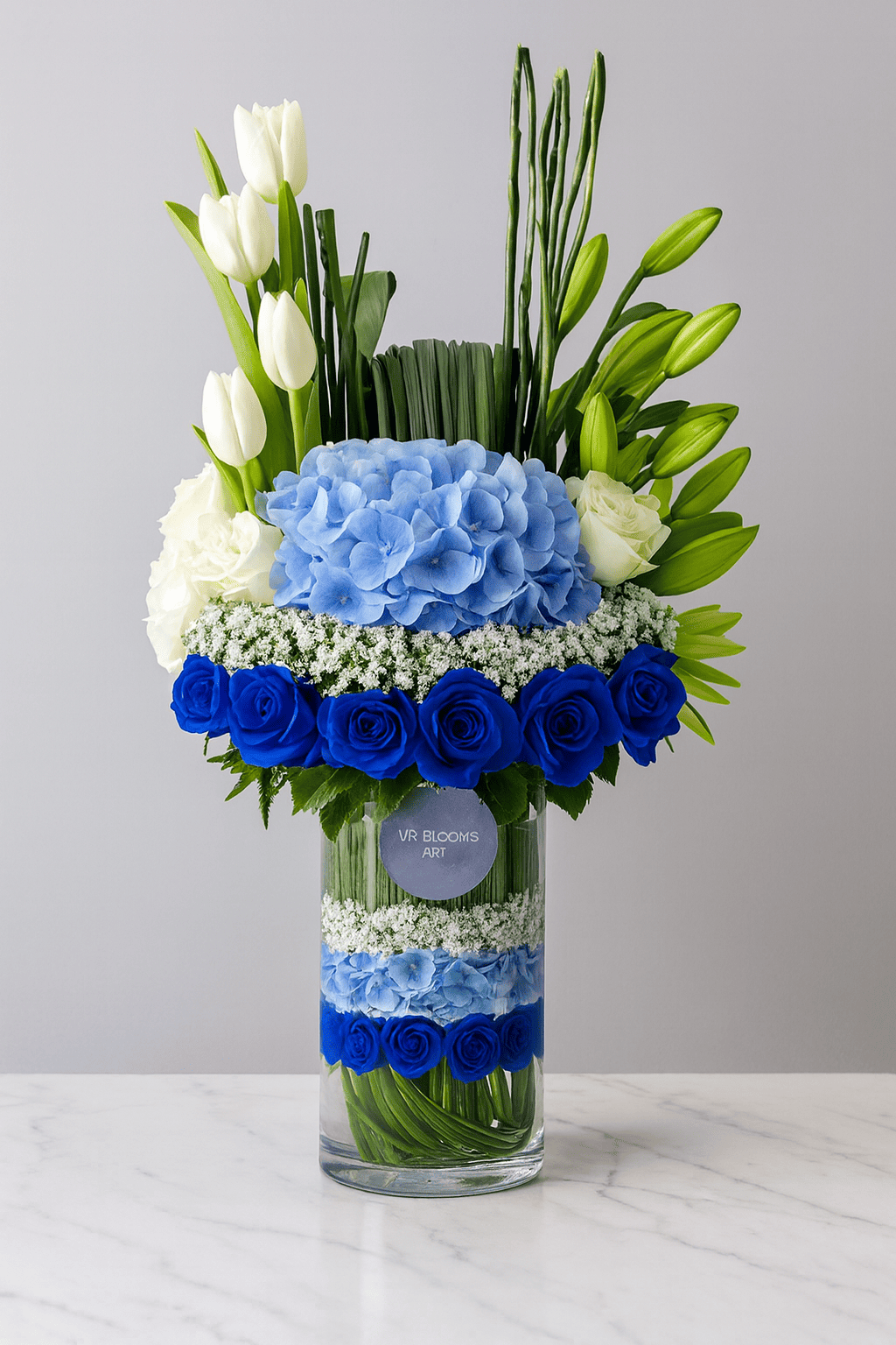 احتفل بوصول المولود بهدية ساحرة تضم زهور بيضاء وزرقاء في تصميم رائع يمنح الفرح والدفء، مثالية للوالدين الجدد.