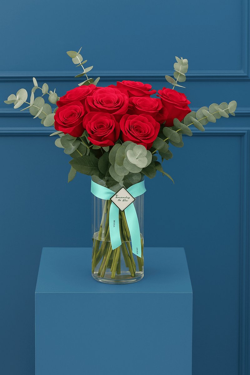 فازة شفافة يحتضنها ورد أحمر كقطعة من الفن الطبيعي، تحتوي علي الجوري الأحمر واليوكاليبتوس .