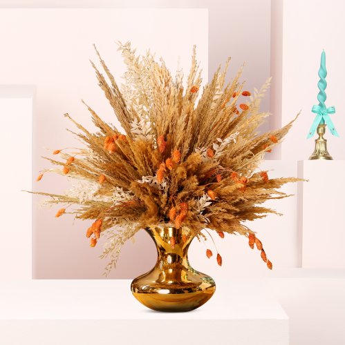 فازة الزجاجية الذهبية تجسد الفخامة والأناقة، حيث تُعتبر إضافة مبهرة لأي ديكور. تصميمها الفريد يبرز جمال المجففات ويعكس الضوء بشكل رائع، مما يمنح المكان جوًا من الرفاهية والتألق.