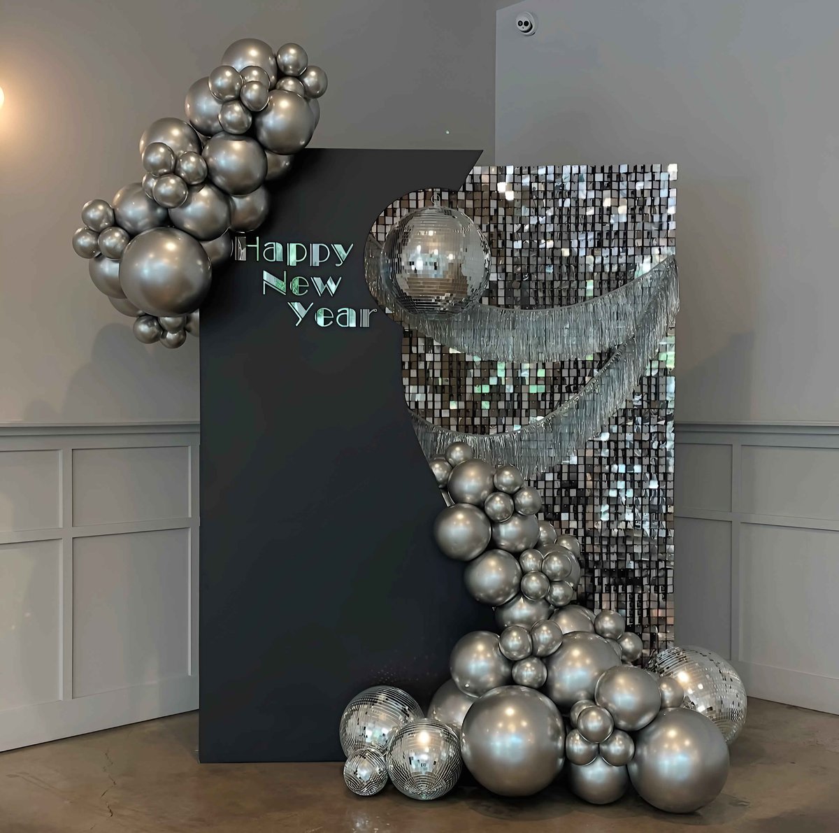 تنسيق عصري لرأس السنة بخلفية سوداء أنيقة تتداخل معها لمسات لامعة من الستان الفضي. تتدلى مجموعات البالونات المعدنية مع كرات الديسكو والخيوط اللامعة لتضفي أجواء احتفالية راقية وبراقة.