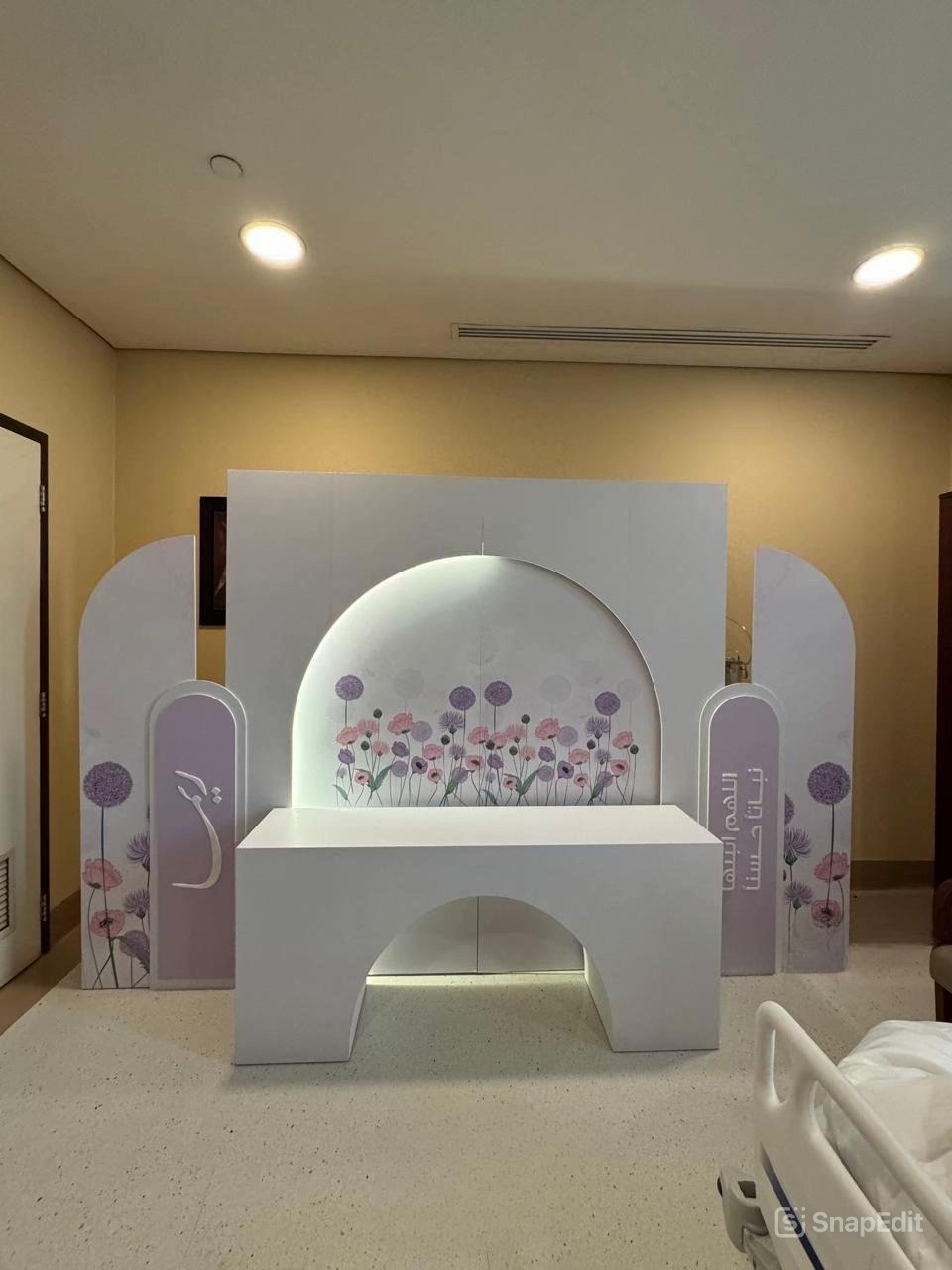 تصميم ركن أمومة أنيق وهادئ بزخارف زهرية ناعمة وأقواس عصرية، مناسب للمستشفيات وأقسام الولادة وغرف استقبال المواليد، يضفي أجواء مريحة ودافئة تعبّر عن العناية والحنان والأمومة.