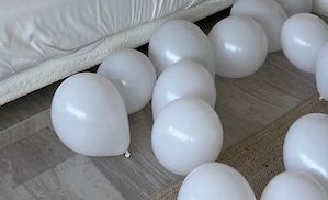 ديكور غرفة العروس بتصميم أنيق ورومانسي ببالونات أبيض وذهبي وردي، مثالي لليلة الزواج أو تجهيزات شهر العسل. يعطي أجواء احتفالية ناعمة تملأ المكان حب وفرح، ويخلي اللحظة ذكرى ما تنسى للعروس.