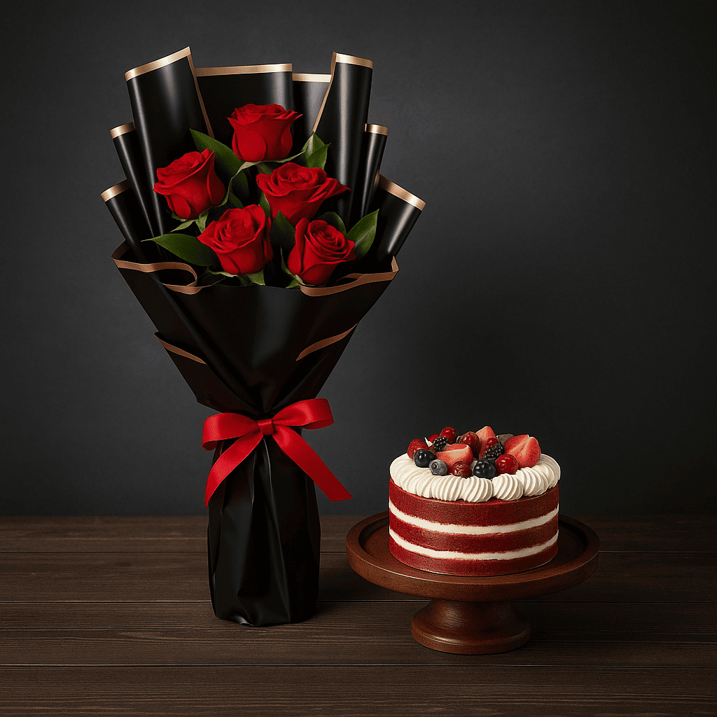 - 6 ورود حمراء - 20 روسكوس - ملفوفة ومربوطة بشكل جميل - كيكة رد فلفت الوزن: نصف كجم