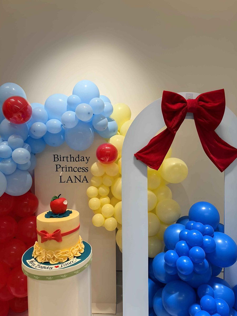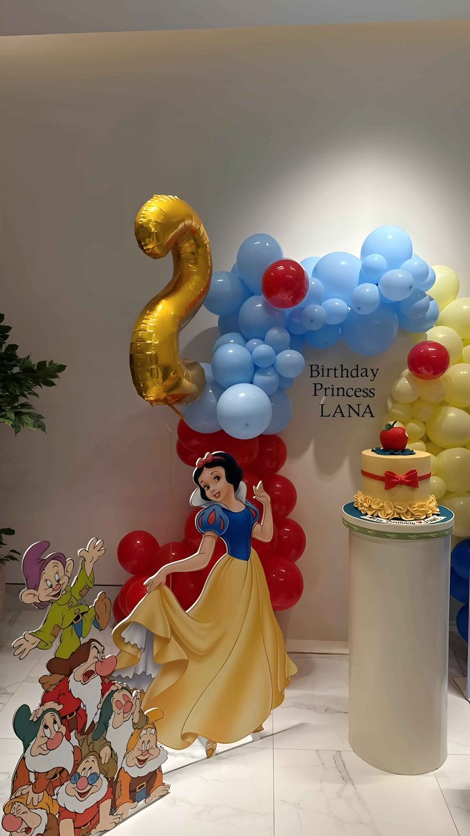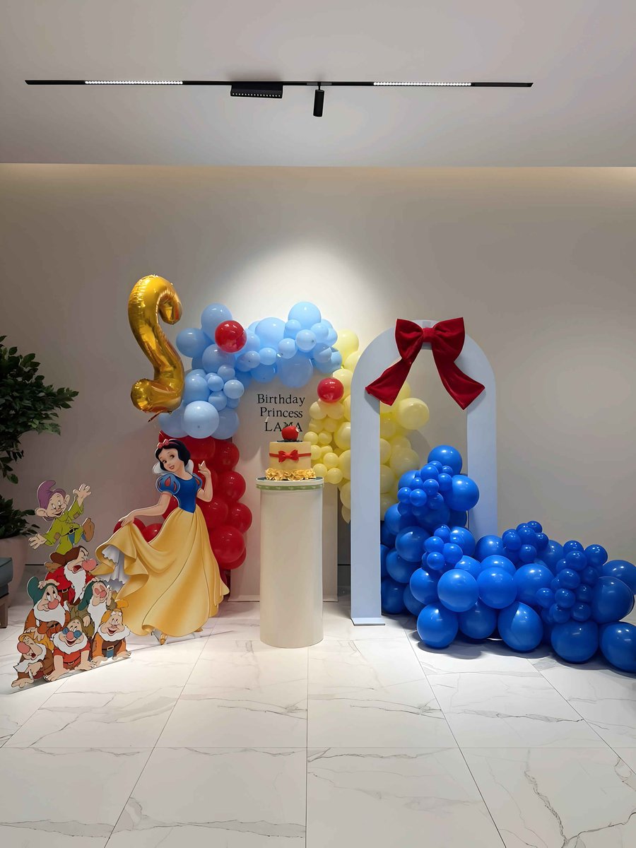 ديكور احتفالي مستوحى من عالم الأميرات بتنسيق ألوان زاهية وبالونات مميزة، مثالي لأعياد الميلاد وحفلات الأطفال والمناسبات الخاصة. تصميم ساحر يضفي أجواء خيالية مثالية للتصوير وصنع ذكريات لا تُنسى.