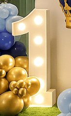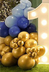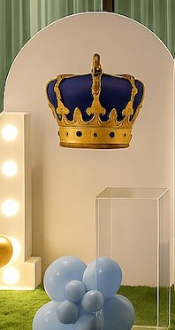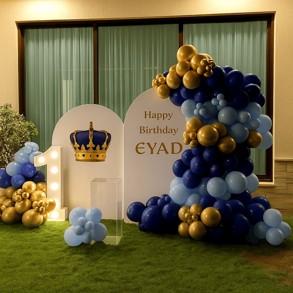 تجهيز عيد ميلاد ملكي باللونين الأزرق والذهبي مع بالونات فاخرة وخلفية تاج ورقم مضيء. يمنح أجواء فخمة ومميزة للاحتفال بأميركم الصغير في يومه الخاص.تجهيز عيد ميلاد ملكي باللونين الأزرق والذهبي مع بالونات فاخرة وخلفية تاج ورقم مضيء. يمنح أجواء فخمة ومميزة للاحتفال بأميركم الصغير في يومه الخاص.