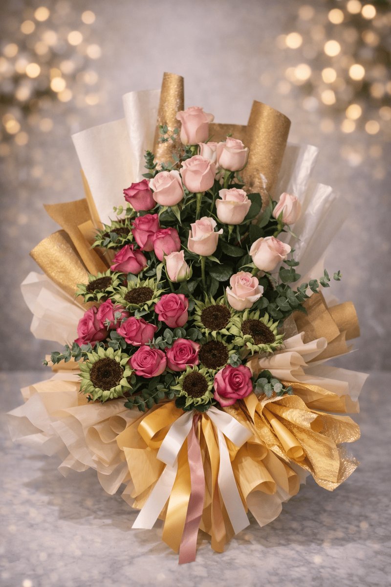 باقة ورد أنيقة بتدرجات وردية ناعمة مع لمسات ذهبية وخضراء منسّقة بذوق راقٍ يعطي إحساس دفء وجمال تنسيق متوازن يلفت النظر ويعكس أناقة التفاصيل