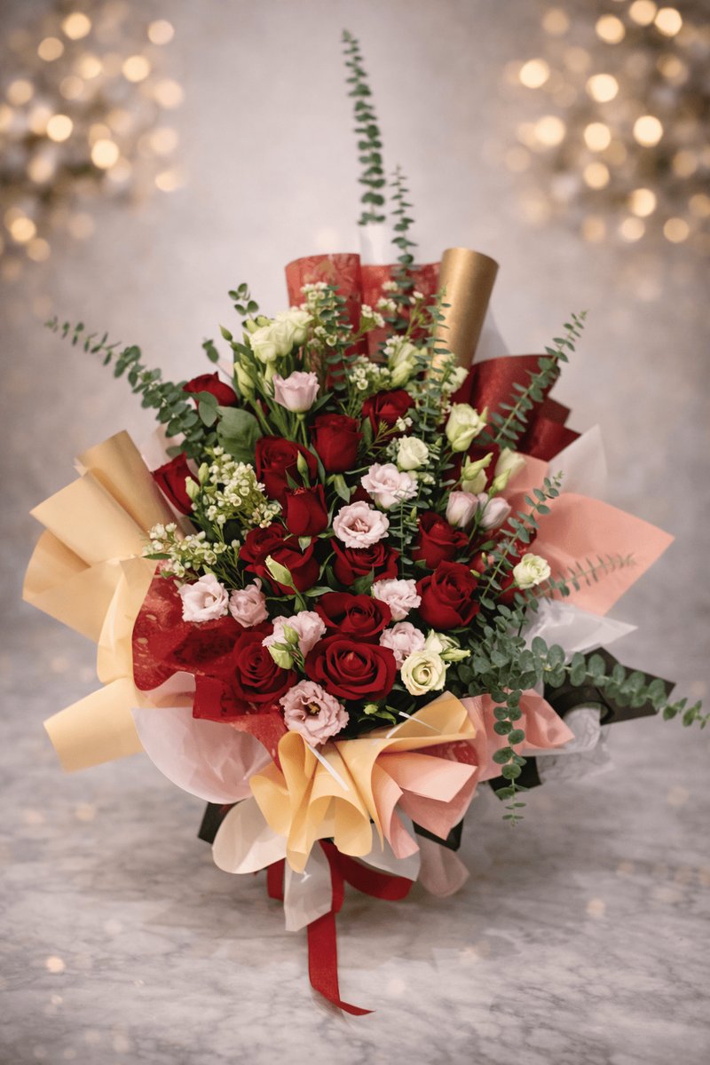 باقة ورد فاخرة تجمع بين الورود الحمراء مع لمسات وردية وخضراء منسّقة بذوق راقٍ وتغليف أنيق اختيار مثالي للتعبير عن الحب والمشاعر القوية في المناسبات الخاصة