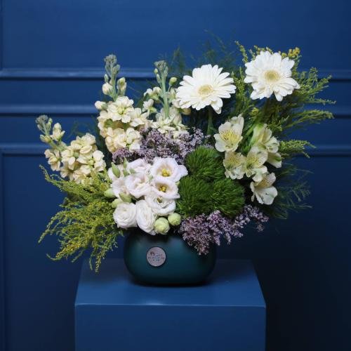 فازة ورد الروح البيضاء مكونه من انواع الورد الجربيرا،الكارنيشن، جابانيز،المتيولا،الاستوما، والستروميريا.