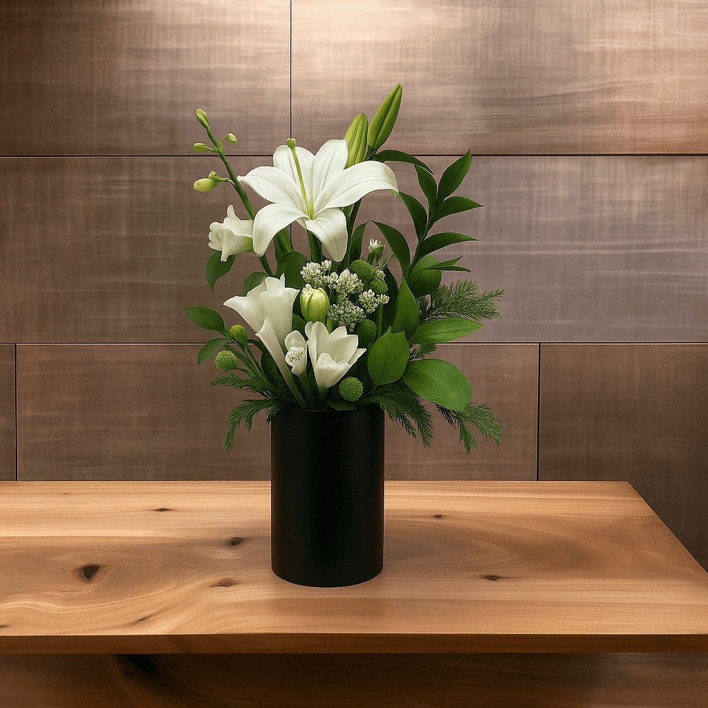 تنسيق أنيق من زنابق بيضاء طازجة مع خضار فخم داخل مزهرية سوداء عصرية. هدية مثالية لأعياد الميلاد والمناسبات أو لتزيين المنزل، وتعبير راقٍ عن النقاء والجمال.