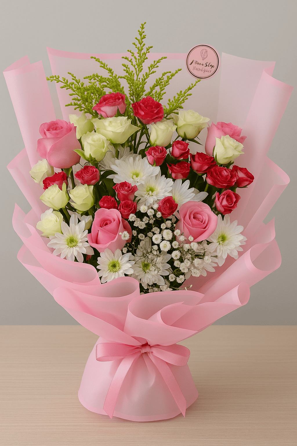 باقة من ورد جوري الأحمر وجوري الوردي وكريس الأبيض مع لمسة من الجيبسوفيلا