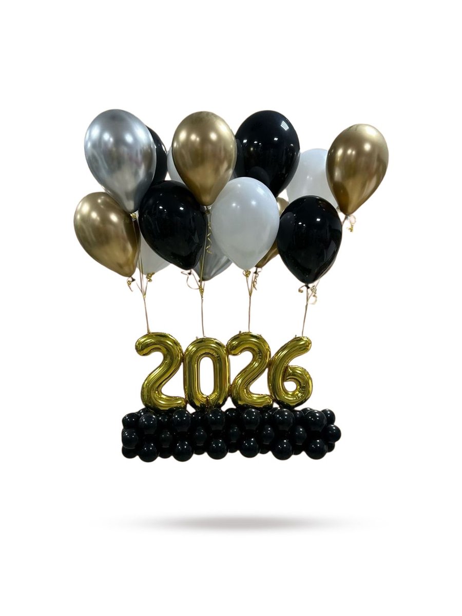 تصميم بالارقام الطائرة المميزة بالالوان من بالونايزر لمناسبة عام 2026 -ارقام صغيرة مقاس 16 انش مع قاعدة بالونات و بالونات هيليوم علوية.