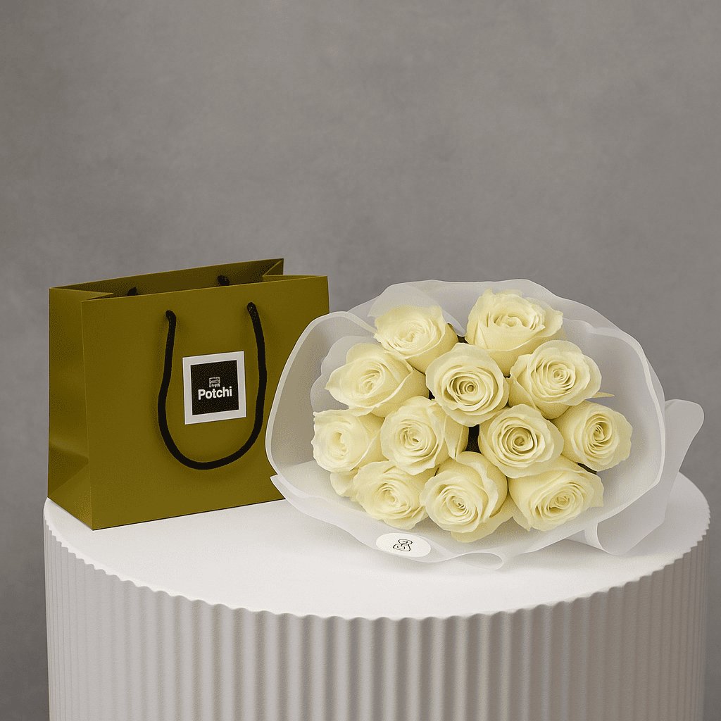 هديه مكونه من 15وردة باللون الأبيض مع تشوكلت باتشي.