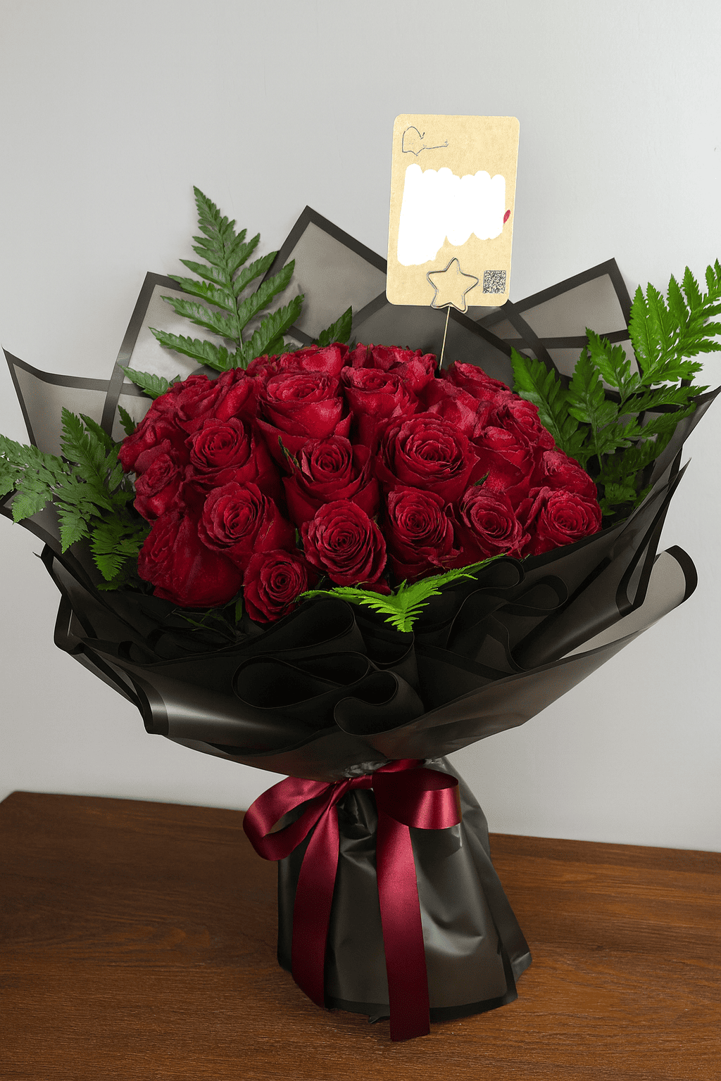 باقة أنيقة من الورد الأحمر الغامق، تجسد الفخامة والرقي بلمسة رومانسية ساحرة.