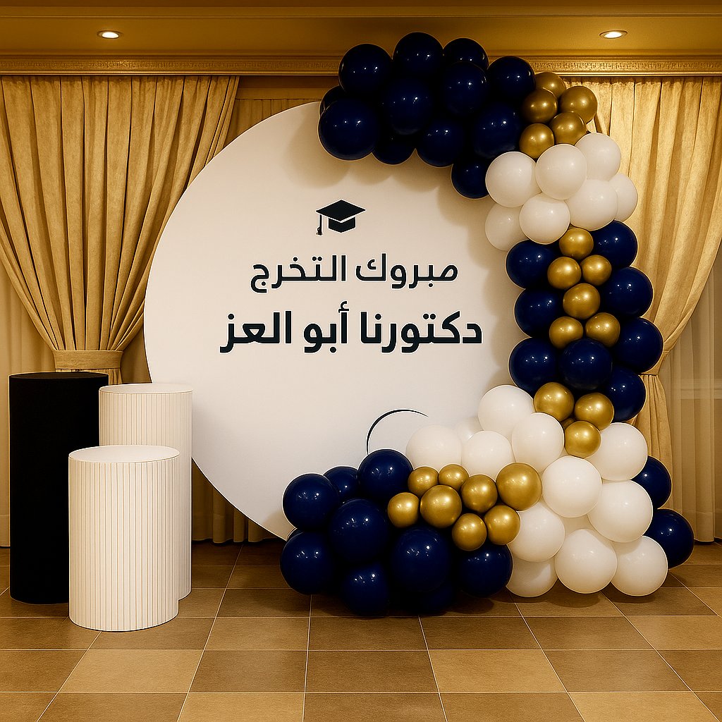 ديكور تخرج راقٍ بتصميم أنيق من البالونات باللون الكحلي والأبيض والذهبي مع خلفية دائرية فاخرة. مثالي لحفلات التخرج الرسمية، حيث يعكس النجاح الأكاديمي ويصنع أجواء احتفالية مميزة ولحظات تصوير خالدة.