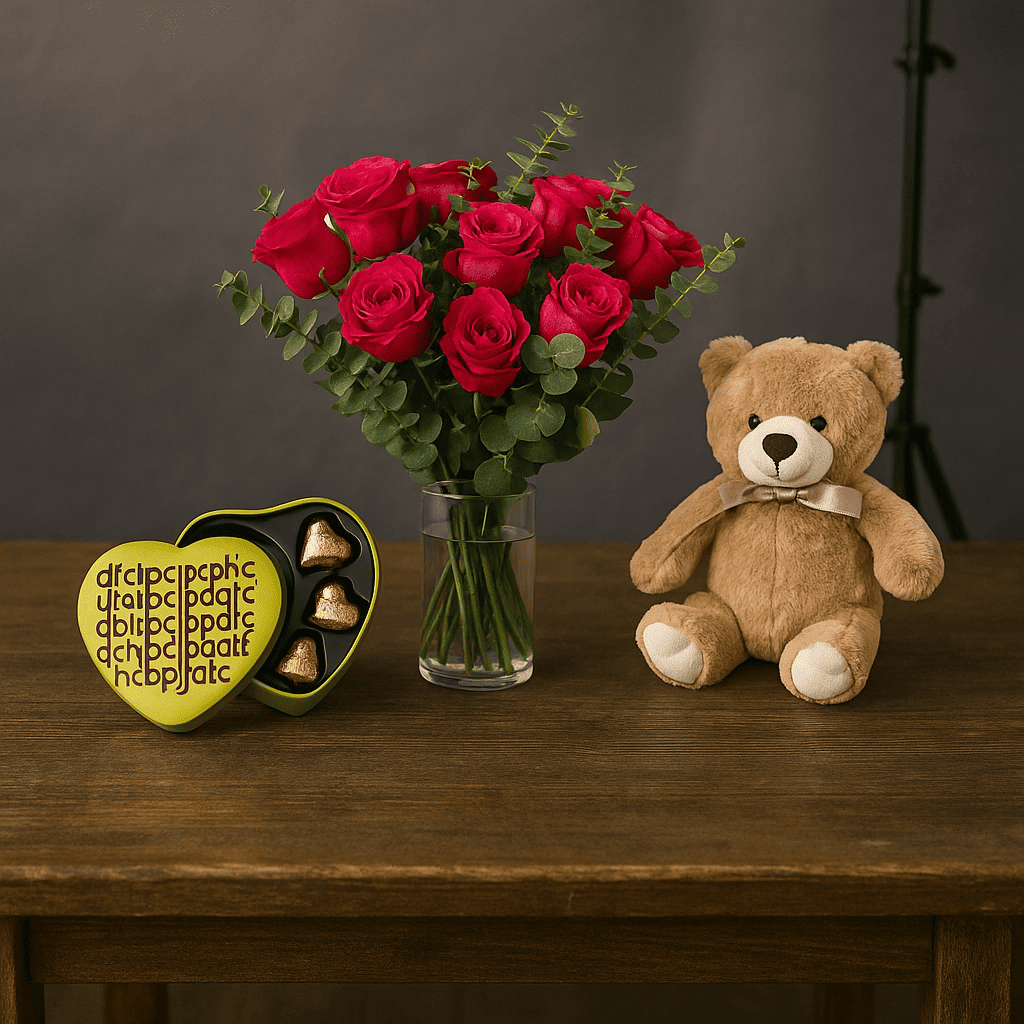 هدية حب مكونة من، فازة ورد احمر، دبدوب وعلبة شوكلاتة باتشي