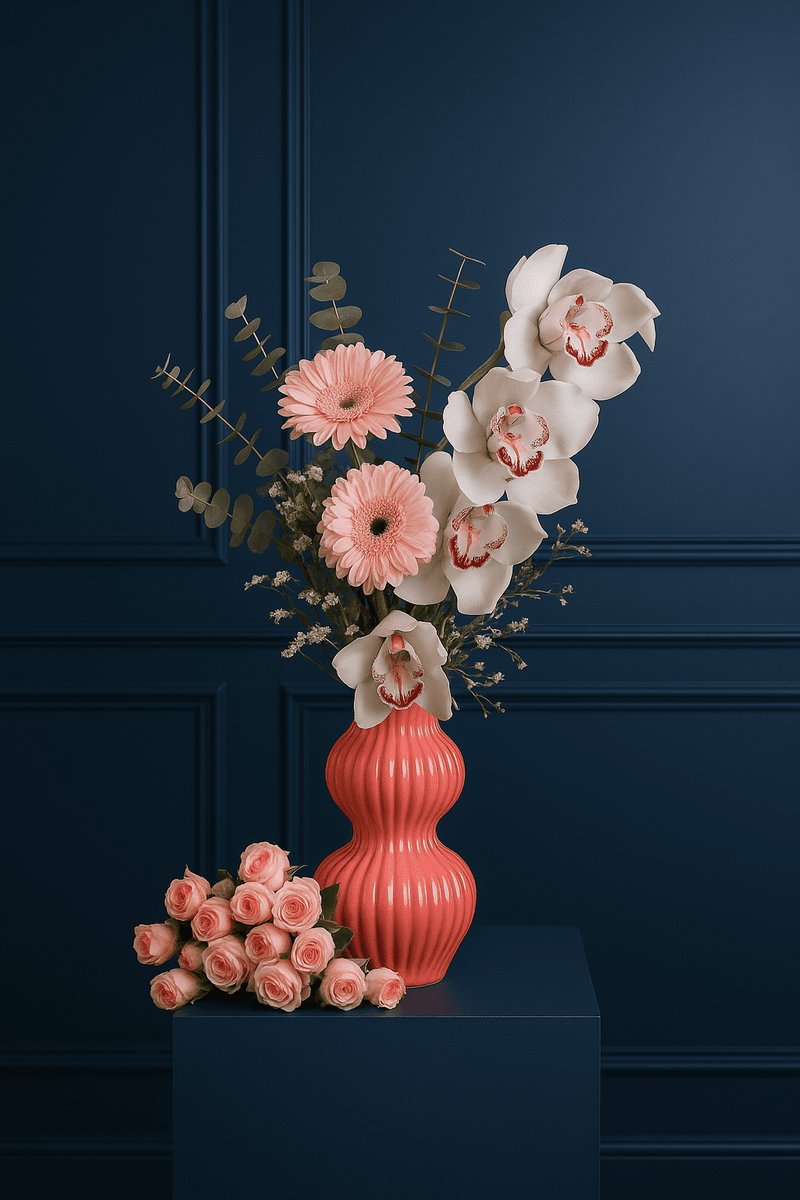 تحتوي الفازة ٢ زهرات جربيرا وردية (كينيا)، غصن من زهرة السمبيديوم الأبيض (تايلاند) ٥ أغصان أكالبتوس (أستراليا)، ٣ أغصان ليمونيوم أبيض (إيطاليا).