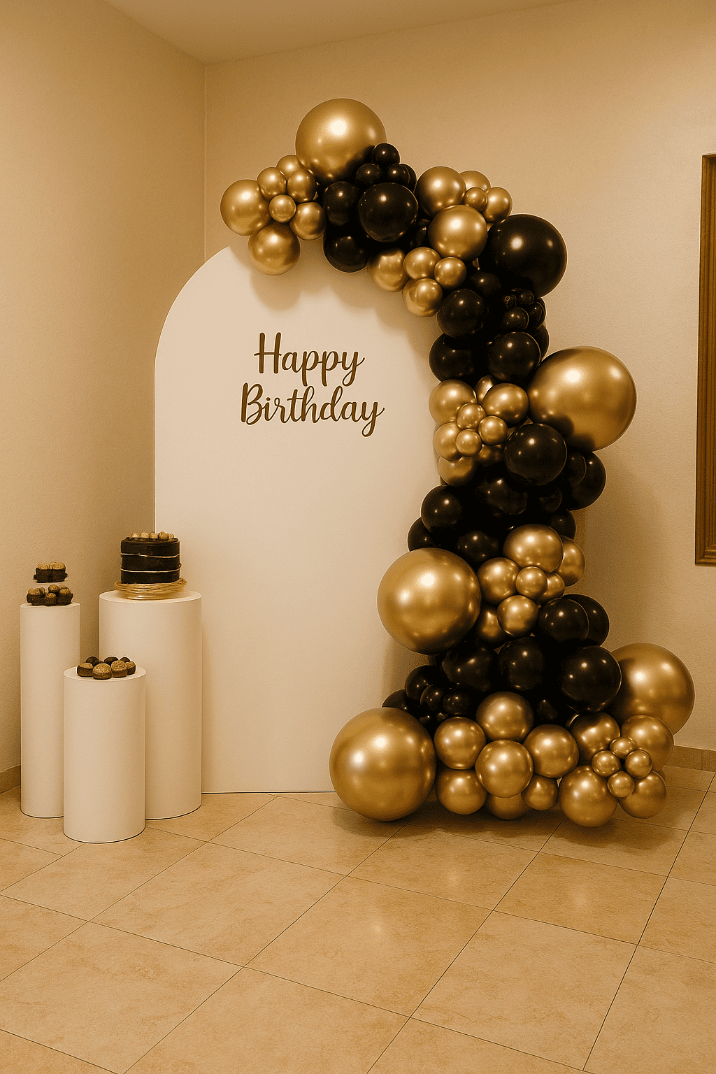 مزيج جريء من اللونين الأسود والذهبي يضفي لمسة من الأناقة والفخامة. تصميم يعكس الاحتفال بأسلوب راقٍ وعصري، يجمع بين البريق والرقي في كل تفصيل ليمنح المناسبة حضورًا فخمًا لا يُنسى.مزيج جريء من اللونين الأسود والذهبي يضفي لمسة من الأناقة والفخامة. تصميم يعكس الاحتفال بأسلوب راقٍ وعصري، يجمع بين البريق والرقي في كل تفصيل ليمنح المناسبة حضورًا فخمًا لا يُنسى.