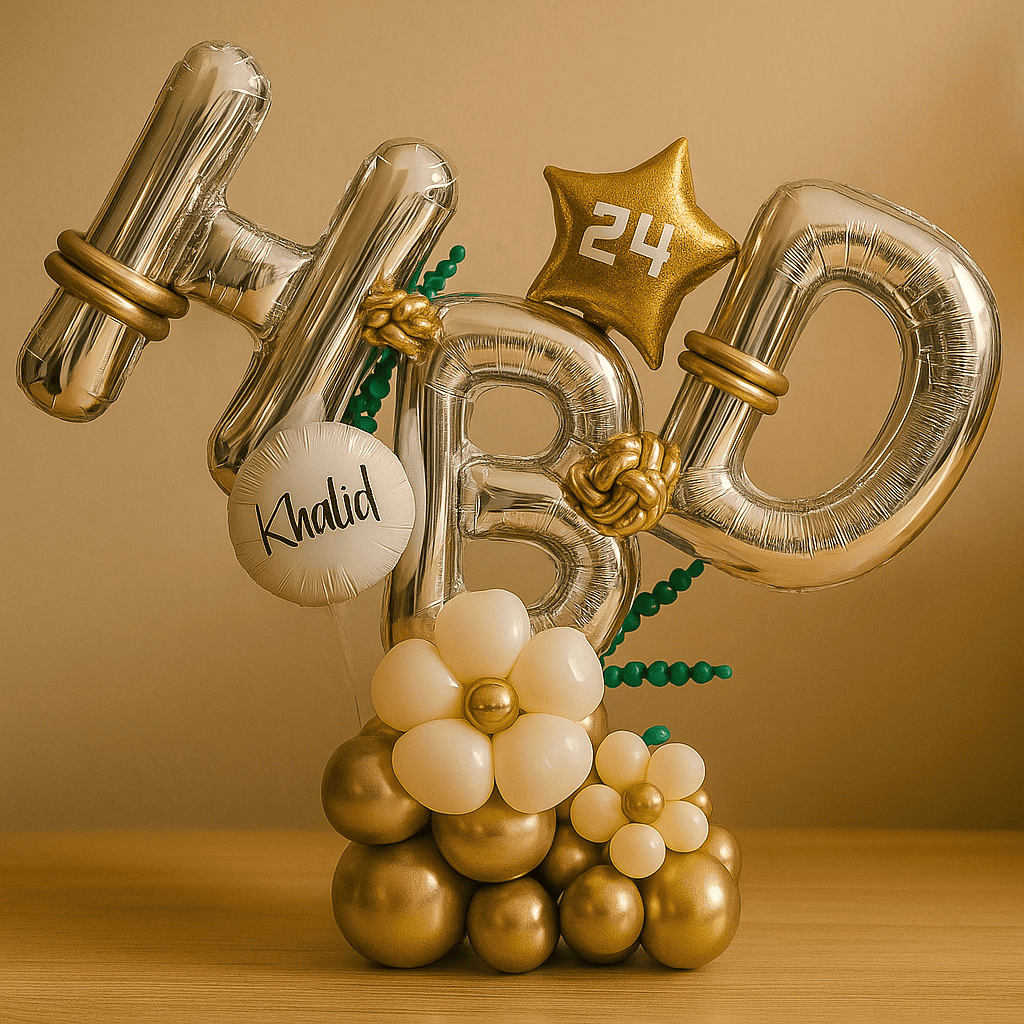 تنسيق صغير وأنيق لعيد الميلاد يجمع بين البالونات باللونين الفضي والذهبي مع لمسات من الزهور البالونية. تصميم يحمل اسم وعمر صاحب المناسبة ليمنح الاحتفال لمسة فاخرة تناسب المساحات الصغيرة أو التجمعات الخاصة.