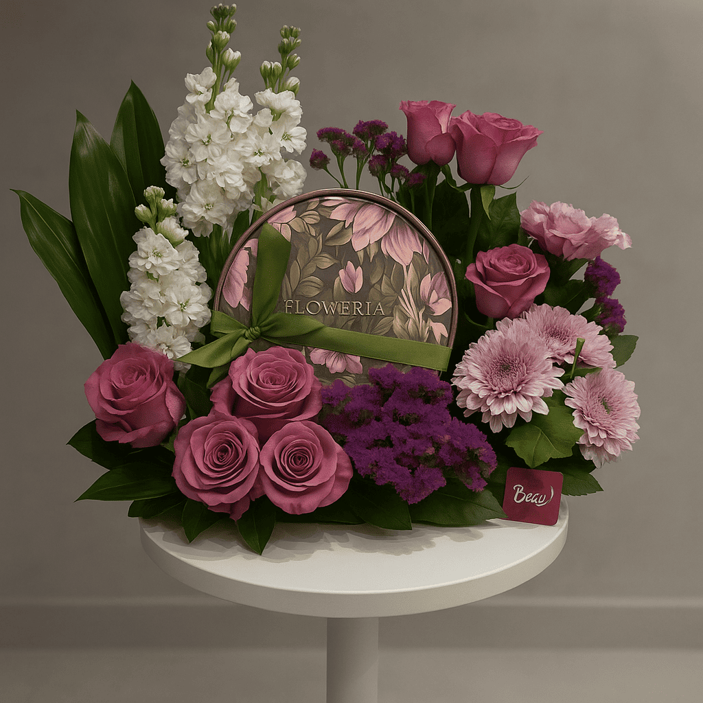 بكج ورود طبيعية ذات ألوان هادئة مع شوكليت هانوفيريان ، مثالية كهدية للتهنئة والمناسبات يتوفر كتابة كرت باللغة العربية والإنجليزية، الرجاء كتابة المطلوب طباعته في الملاحظات