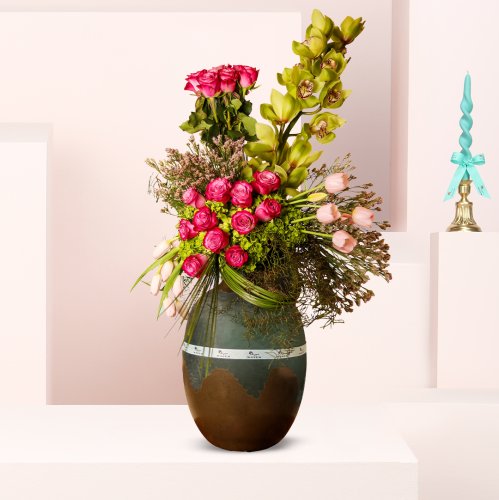تنسيق أنيق يضم وروداً وردية زاهية وأزهاراً ناعمة وخضاراً طبيعياً في مزهرية فاخرة. مناسب لأعياد الميلاد والمناسبات أو لإضفاء لمسة فخمة على أي مكان.