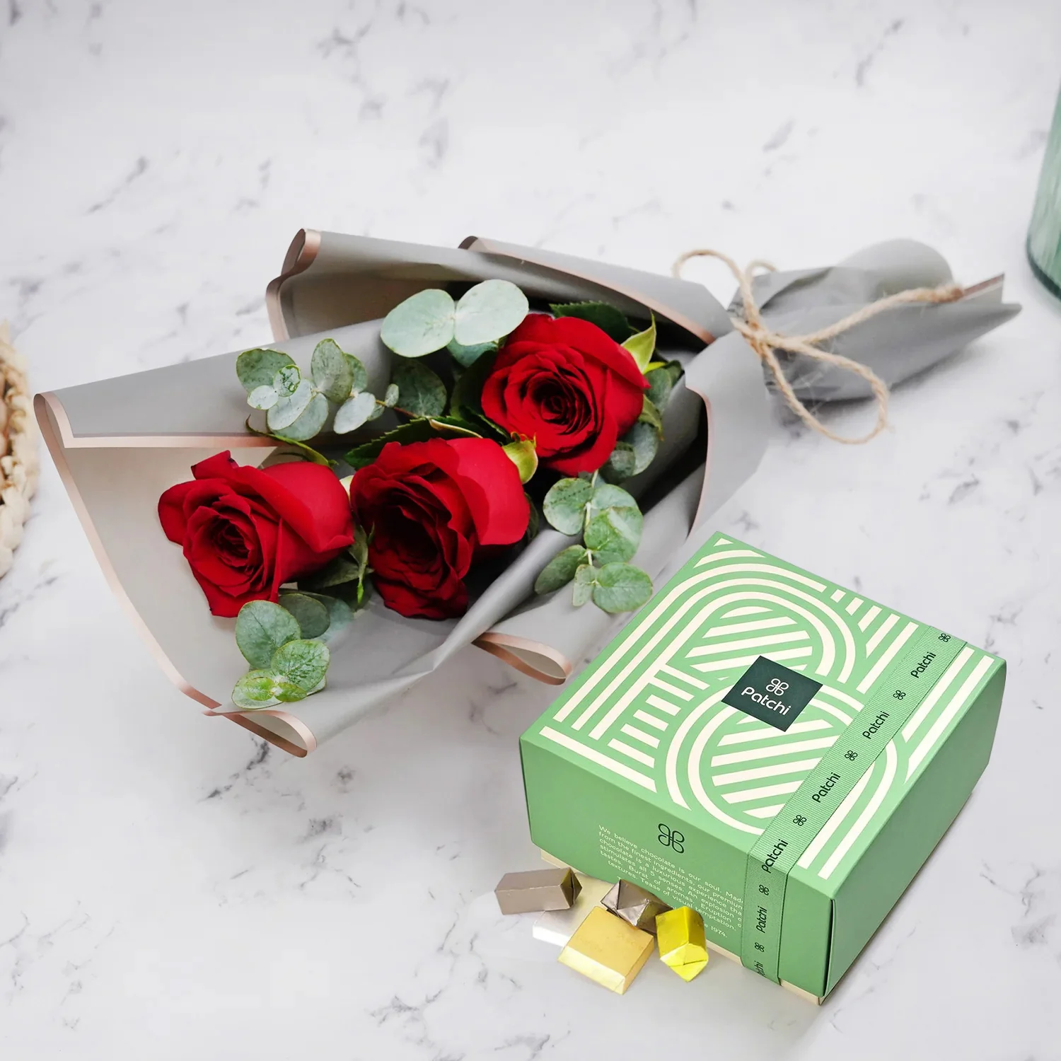 - شوكولاتة باتشي - 250 جرام - باقة من 3 ورود حمراء