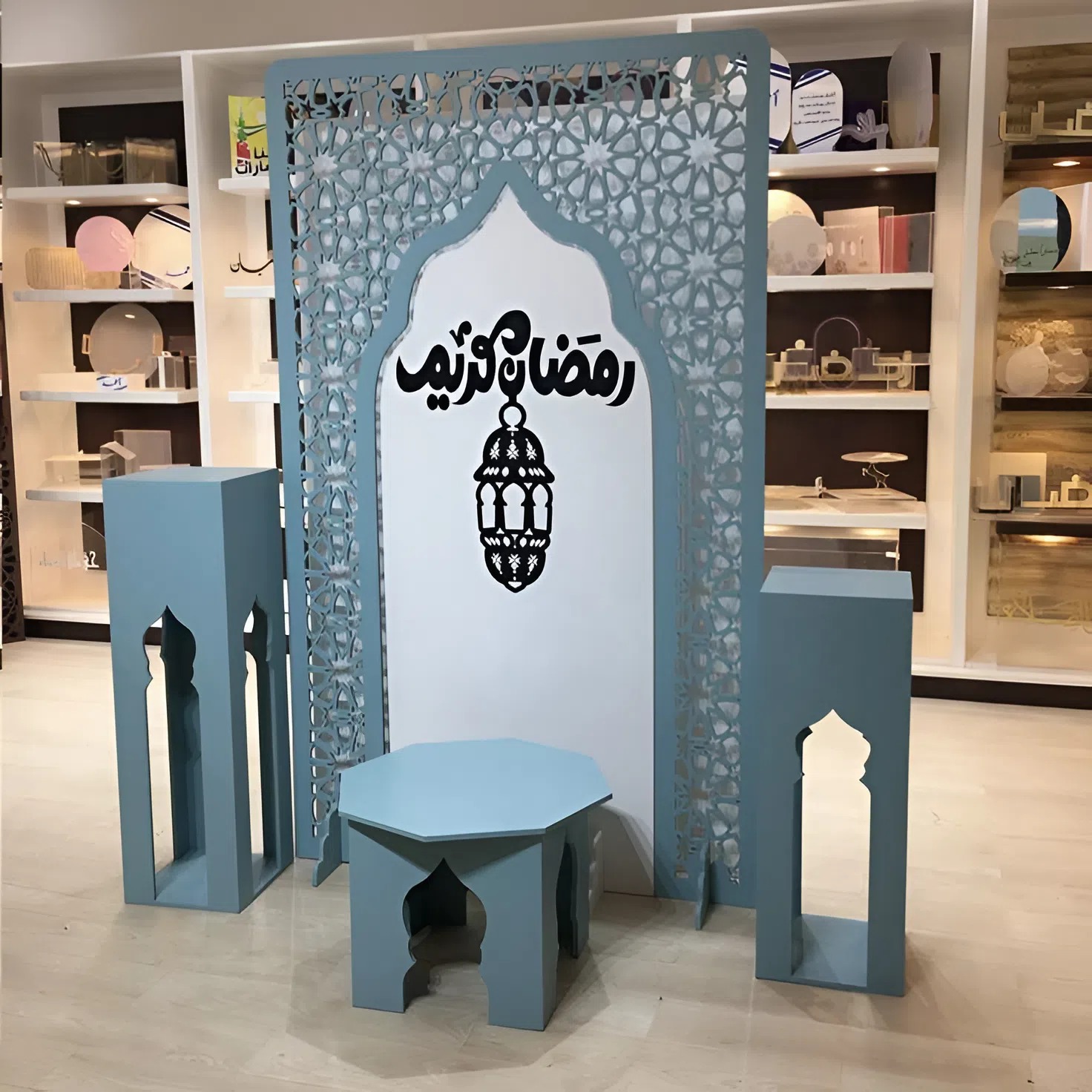 للبيع ركن رمضاني بتصميم فريد باللون الأزرق الملكي، مخصص ليكون قلب ديكور منزلك. التنسيق يشمل حاجزاً خلفياً وطاولة ضيافة وأعمدة جانبية. قطعة مثالية لتنسيق زاوية القهوة أو ركن الصلاة في البيت بلمسة إبداعية وألوان هادئة.