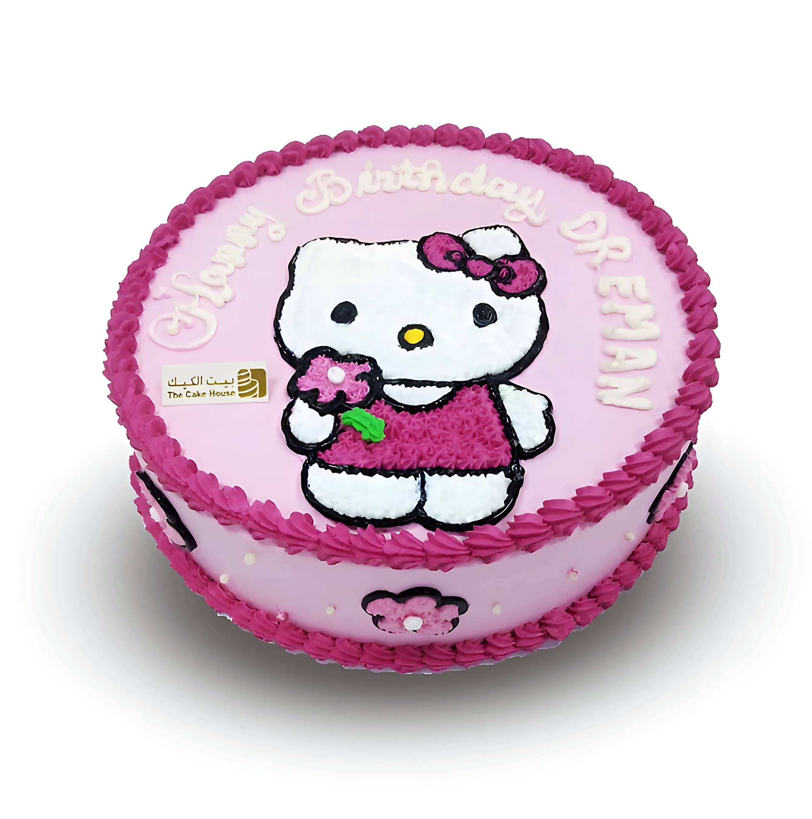 كيكة دائرية بتصميم هالو كيتي، مزينة بكريمة وردية وتفاصيل زهرية، مع عبارة "Happy Birthday" مكتوبة على الوجه العلوي, تكفي لعدد ١٥ شخص