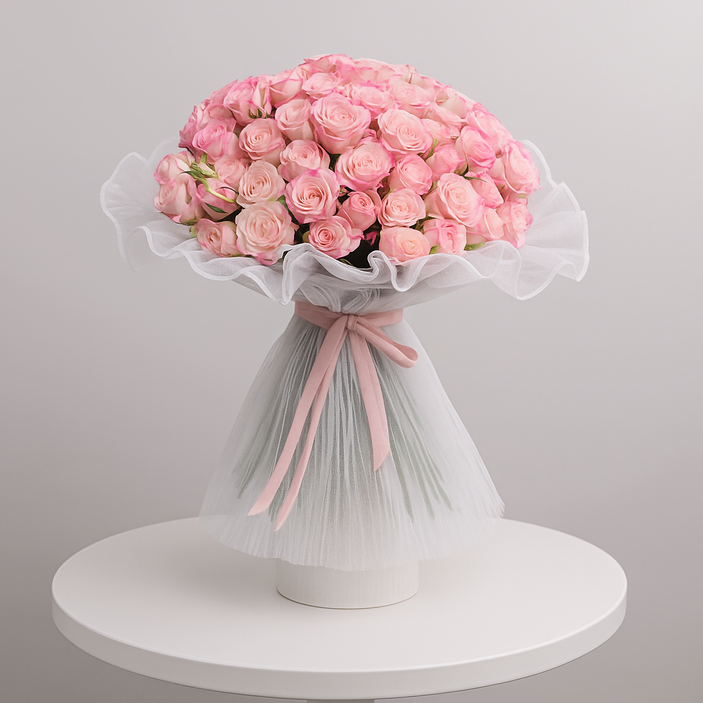 باقة حالمة من الورد الوردي بدرجات متعددة، مغلّفة بشبك ناعم ومربوطة بشريط وردي خفيف ولمسة أنثوية راقية