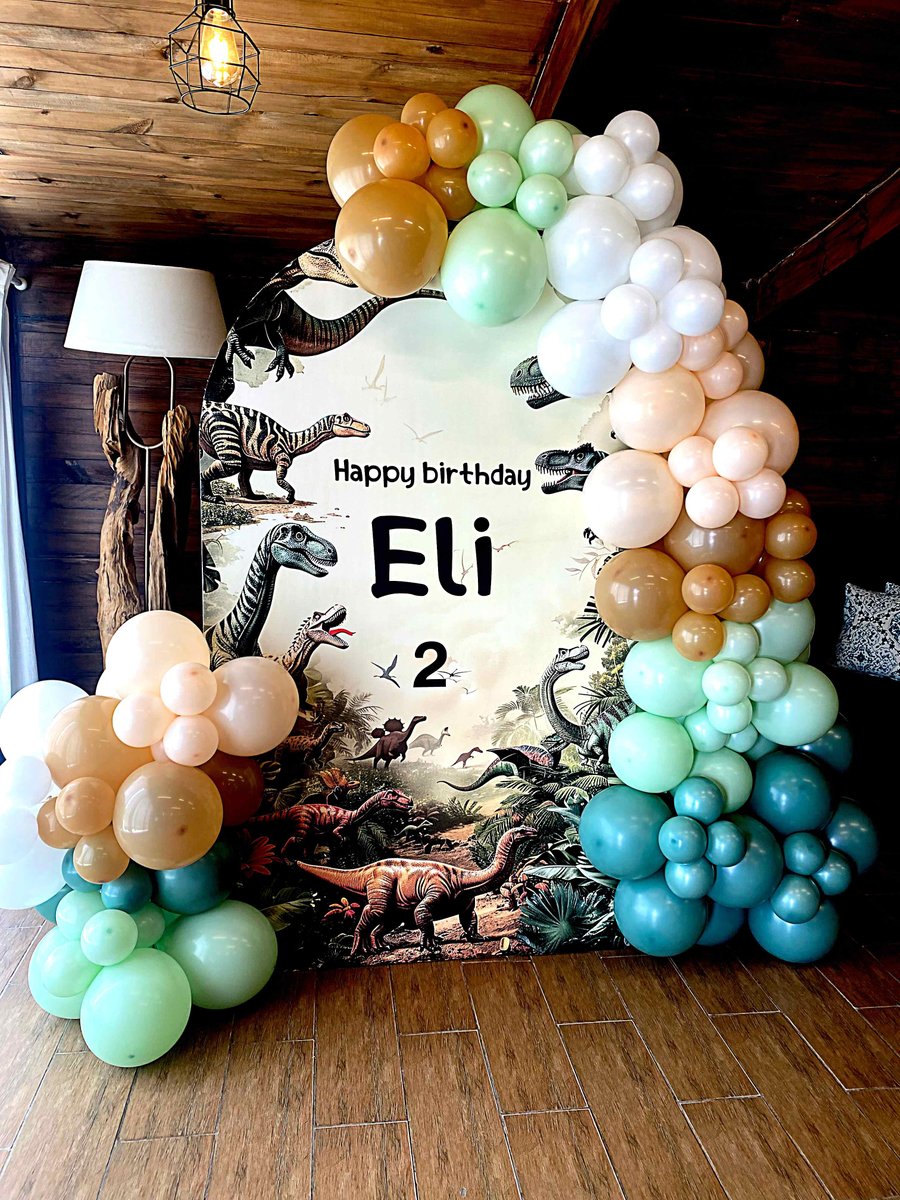 ديكور حفلة عيد ميلاد مستوحى من عالم الديناصورات مع رسوم الغابة وبالونات بألوان هادئة وتصاميم ديناصورات جميلة. مثالي لحفلات الأطفال ولإضافة أجواء مليئة بالمغامرة لأي احتفال بعيد الميلاد.