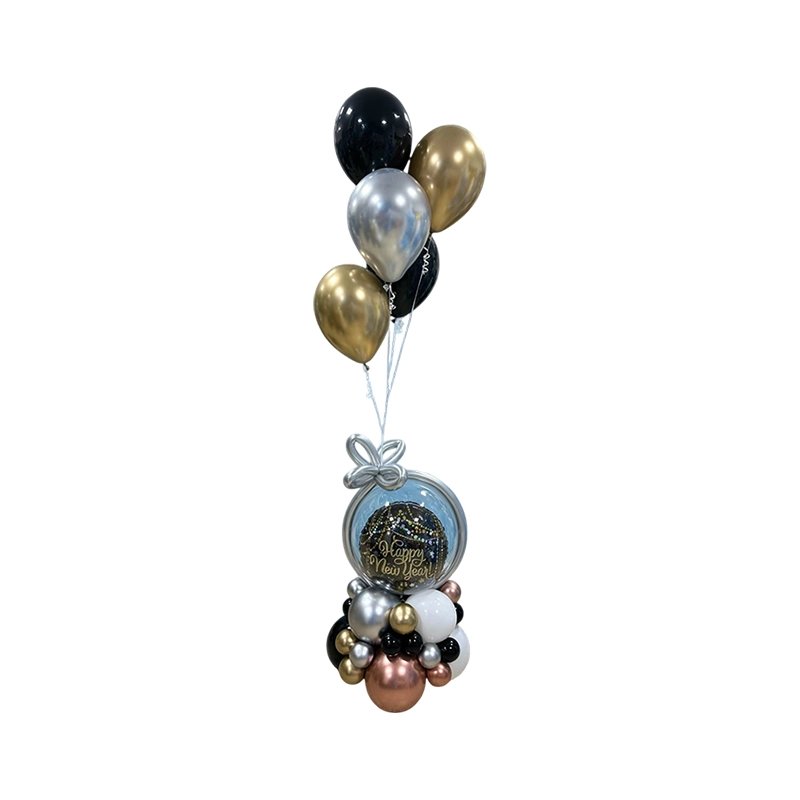 تصميم|Happy New Year Luxe يتكون من: -باقة بالون -تصميم مميز للسنة الجديدة -قاعدة بالونات مميزة