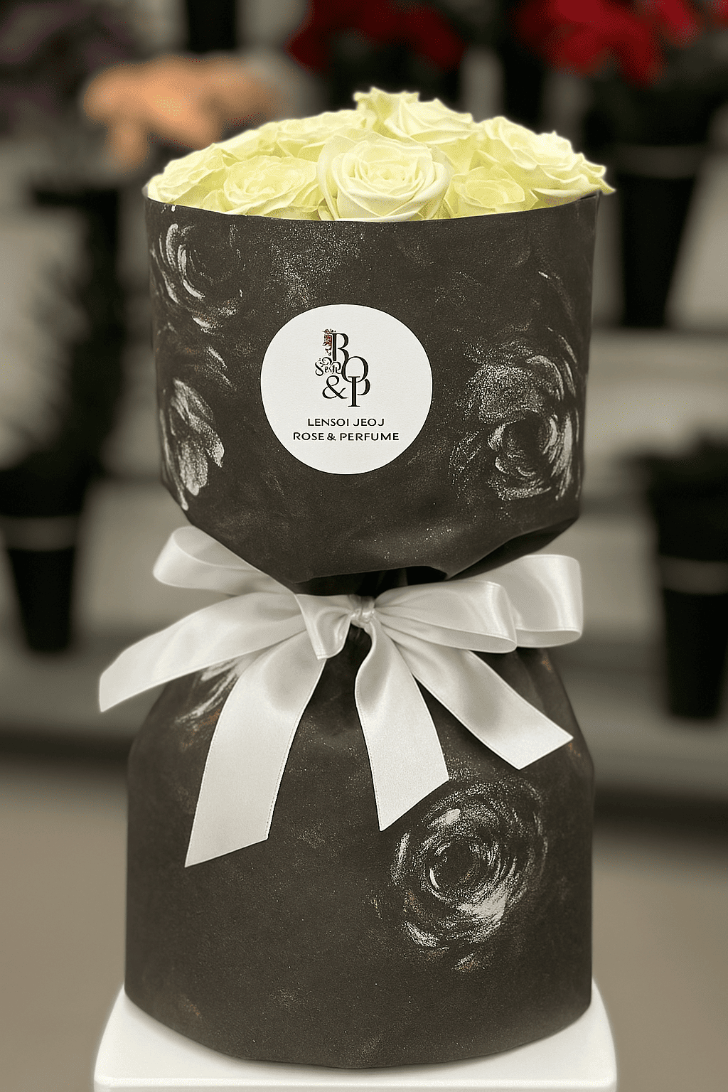 باقة فاخرة من الورود، منسقة بأناقة داخل تغليف داكن مزخرف بنقوش وردية فنية، ومزينة بشريط ساتان أبيض.