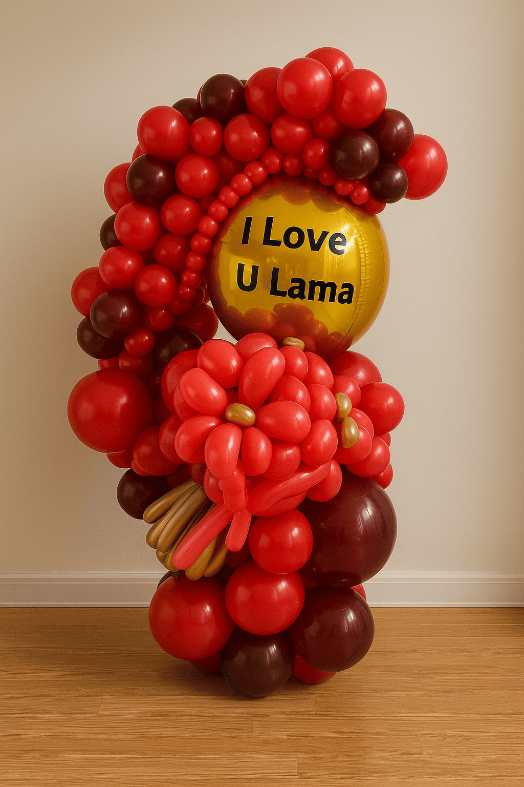 باقة جذابة من البالونات الحمراء والعنابية مع بالون ذهبي يحمل رسالة حب، وتنسيق زهرة بالونات مميز. مناسبة للذكرى، والمفاجآت الرومانسية، والتهنئات الخاصة. هدية معبّرة وفاخرة لإظهار الحب بطريقة مبتكرة.