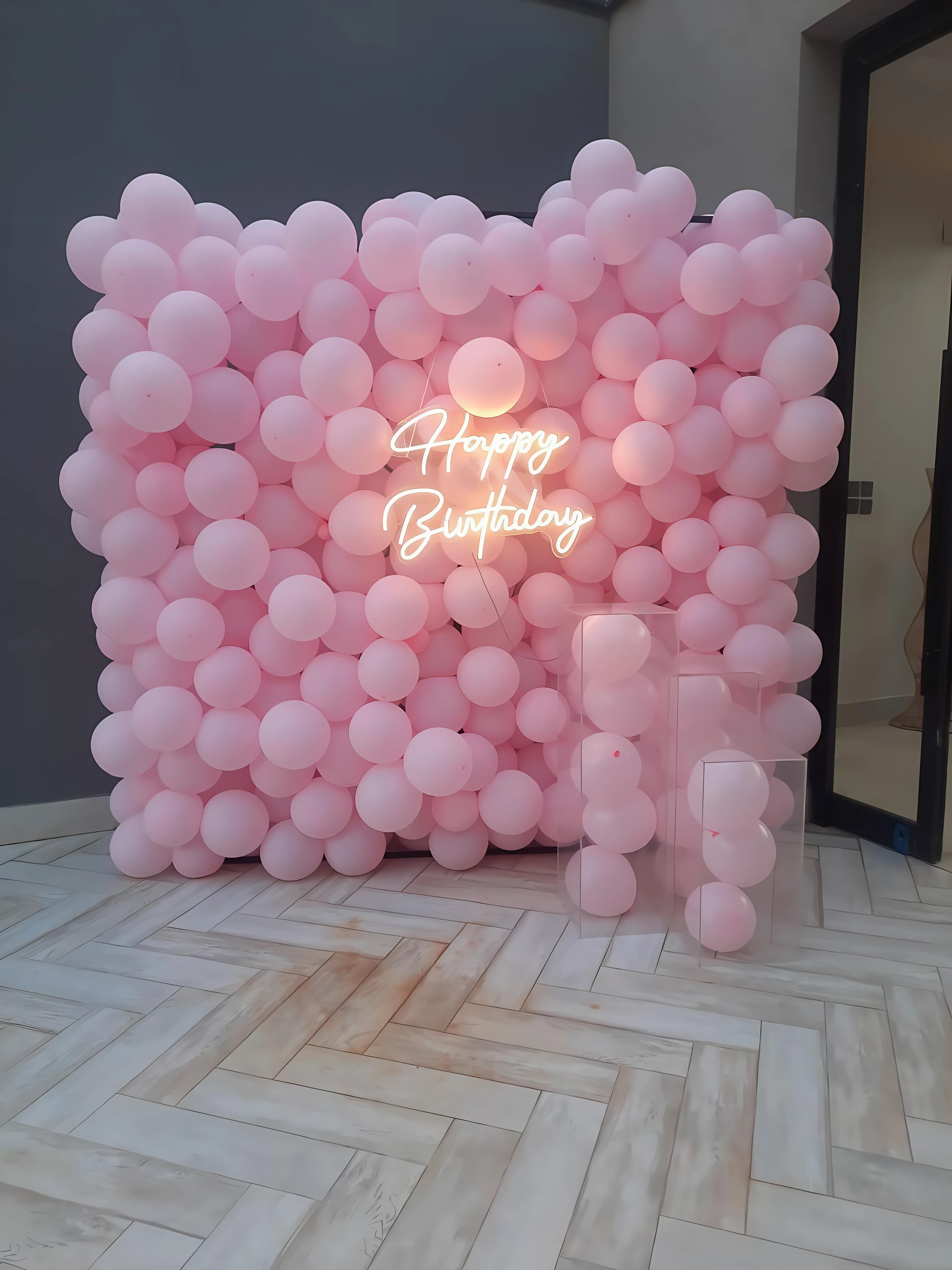 جدار بالونات وردية بإضاءة نيون ناعمة يمنح الاحتفال لمسة فخمة مناسبة لأعياد الميلاد، استقبال المواليد، حفلات الكشف، والتهنئة. ديكور عصري مثالي للتصوير وصنع ذكريات جميلة.جدار بالونات وردية بإضاءة نيون ناعمة يمنح الاحتفال لمسة فخمة مناسبة لأعياد الميلاد، استقبال المواليد، حفلات الكشف، والتهنئة. ديكور عصري مثالي للتصوير وصنع ذكريات جميلة.