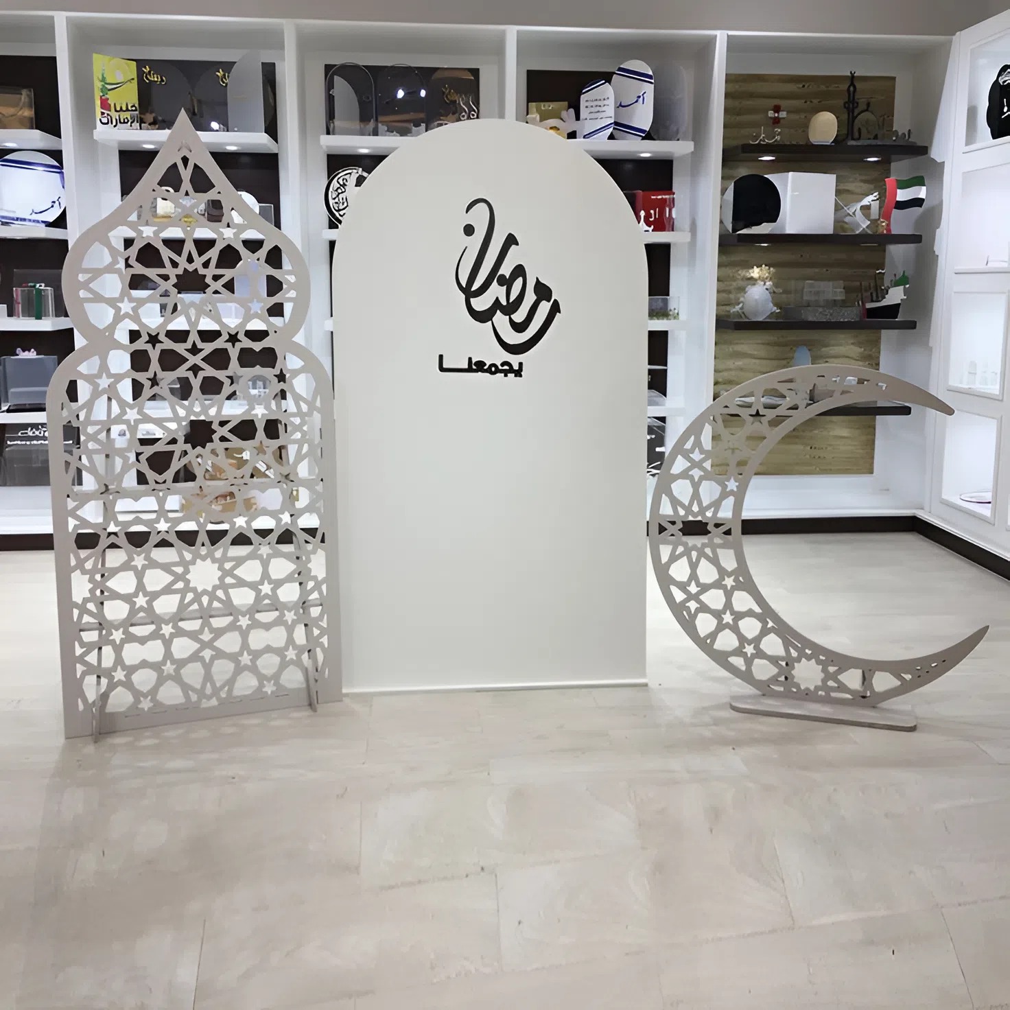 لمحبي البساطة، ديكور رمضاني أبيض للبيع يمنح منزلك إضاءة وشعوراً بالاتساع. يشمل ركن متكامل من 3 قطع: هلال وخلفية "رمضان يجمعنا" وحاجز ديكور. مثالي لتنسيق زوايا البيت بطابع مودرن يجمع العائلة في أجواء روحانية
