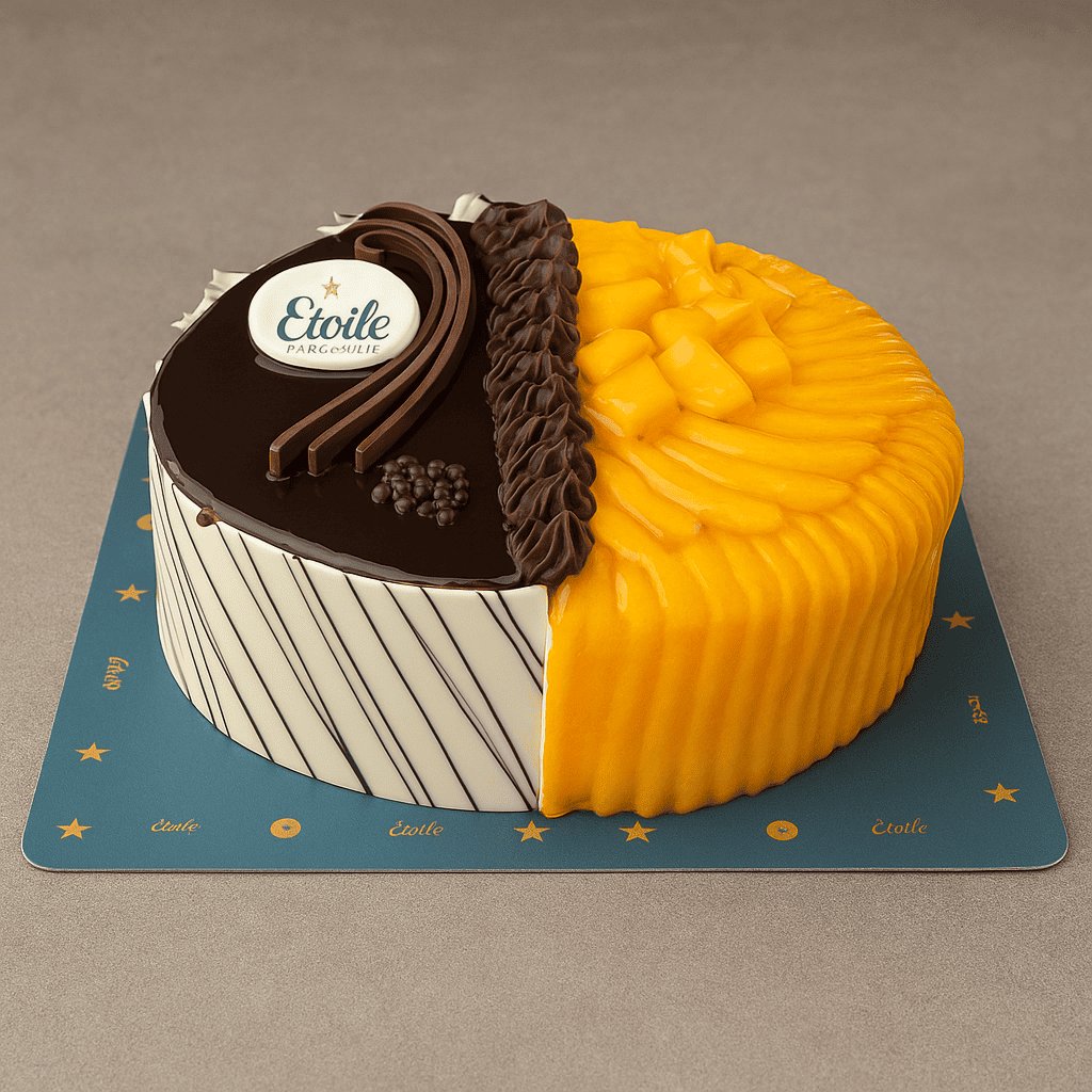 تورته ٢٤ و نصف، تحتوي علي نصف من المانجو والآخر تشوكلت، تكفي ٨ أشخاص.