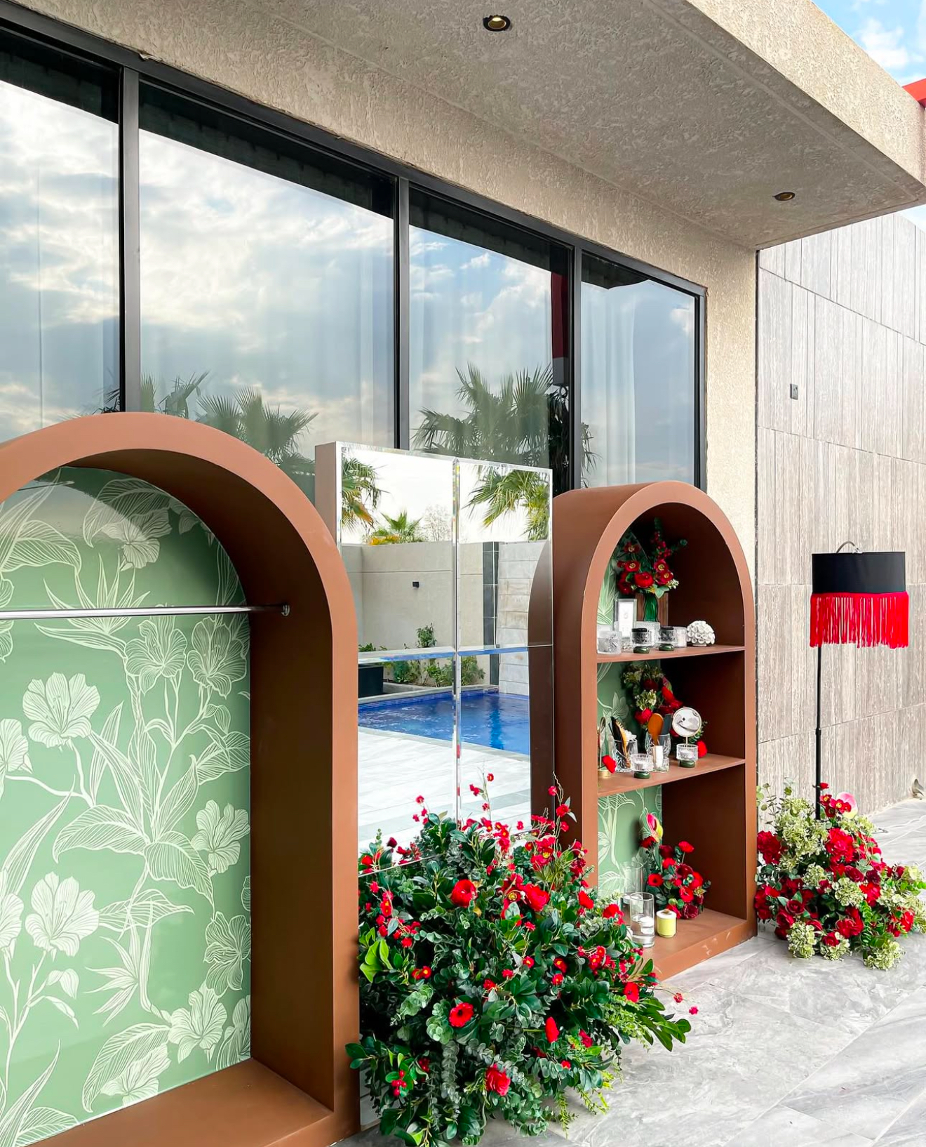 تنسيق زهور فاخر مع ديكور عصري وأرفف أنيقة مزينة بالورود الحمراء والخضار الطبيعي. مناسب لحفلات الزفاف والخطوبة والاستقبالات وزوايا التصوير. يمنح المكان جمالاً ورقياً ويضيف لمسة مميزة لأي احتفال أو ديكور حفلات بأسلوب راقٍ وجذاب.