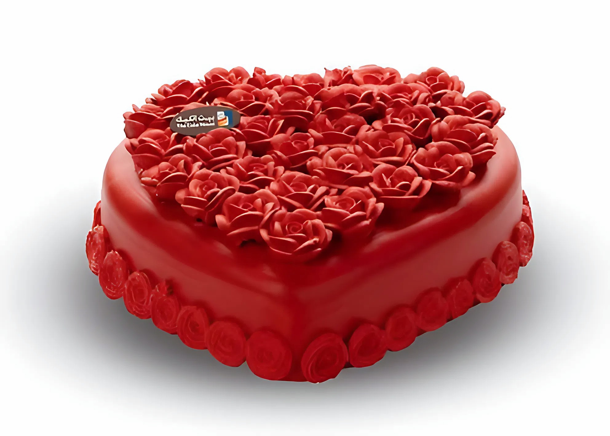 كيكة على شكل قلب مغطاة بالكامل بورود حمراء منحوتة، مثالية للتعبير عن الحب بطريقة فخمة وملفتة.