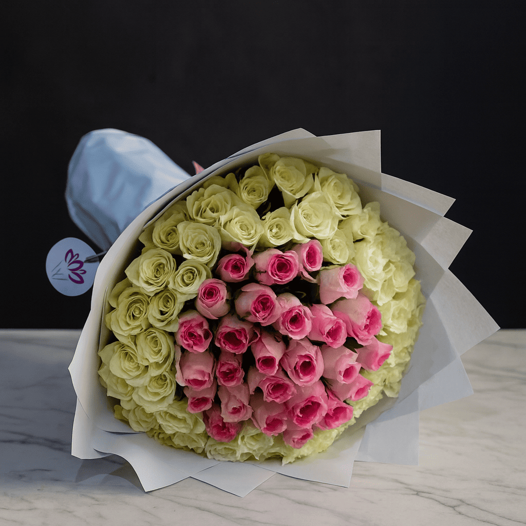 أضف لمسة من الأناقة والرقة مع هذه الباقة الجميلة المصنوعة من الورد الوردي والأبيض، والمغلفة بورق أبيض أنيق. هذه الباقة تعتبر الخيار المثالي لمناسبات الذكرى السنوية، المواليد الجدد، وأعياد الميلاد، حيث تعبر عن الحب والفرح