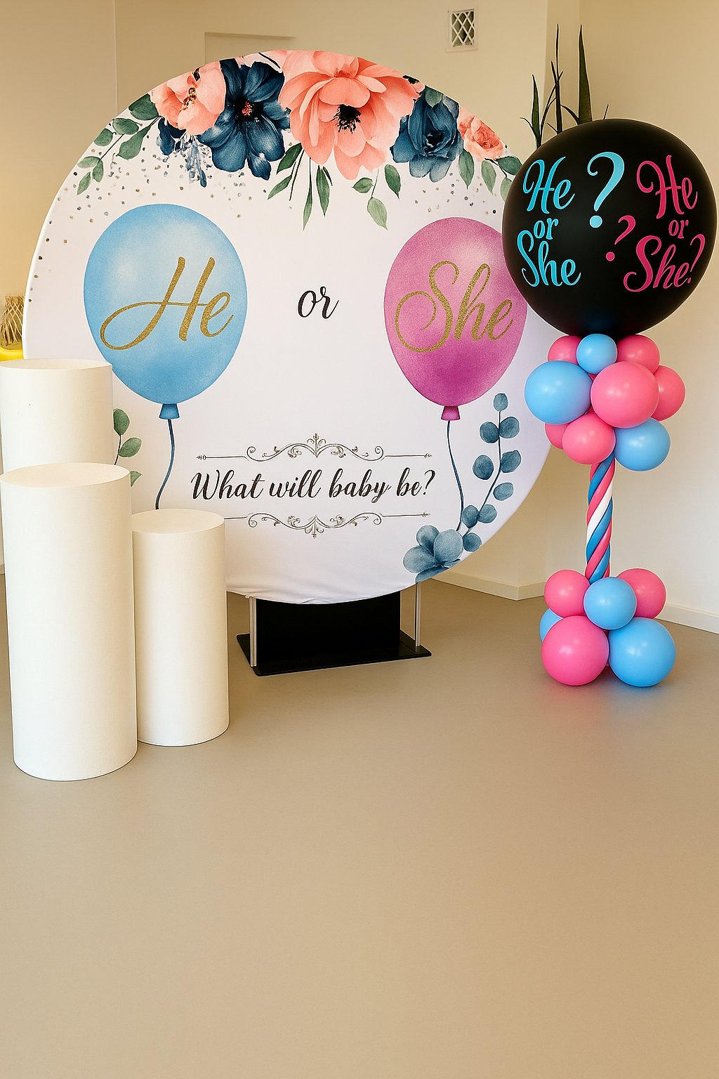 ديكور أنيق لحفلة الكشف عن جنس المولود بتصميم دائري مزين بالزهور وبالونات وردية وزرقاء. مثالي لحفلات بيبي شو أو حفلات كشف المولود بأسلوب راقٍ ومبهج.ديكور أنيق لحفلة الكشف عن جنس المولود بتصميم دائري مزين بالزهور وبالونات وردية وزرقاء. مثالي لحفلات بيبي شو أو حفلات كشف المولود بأسلوب راقٍ ومبهج.